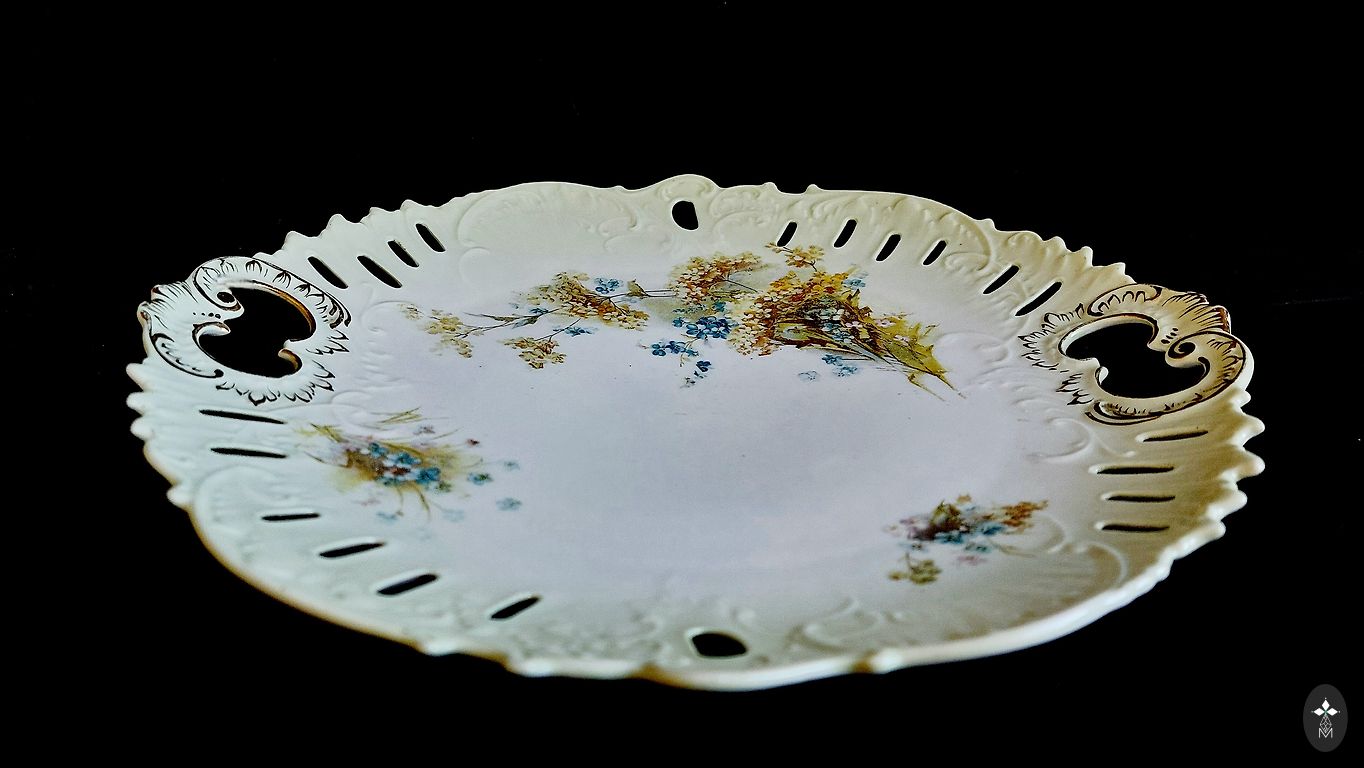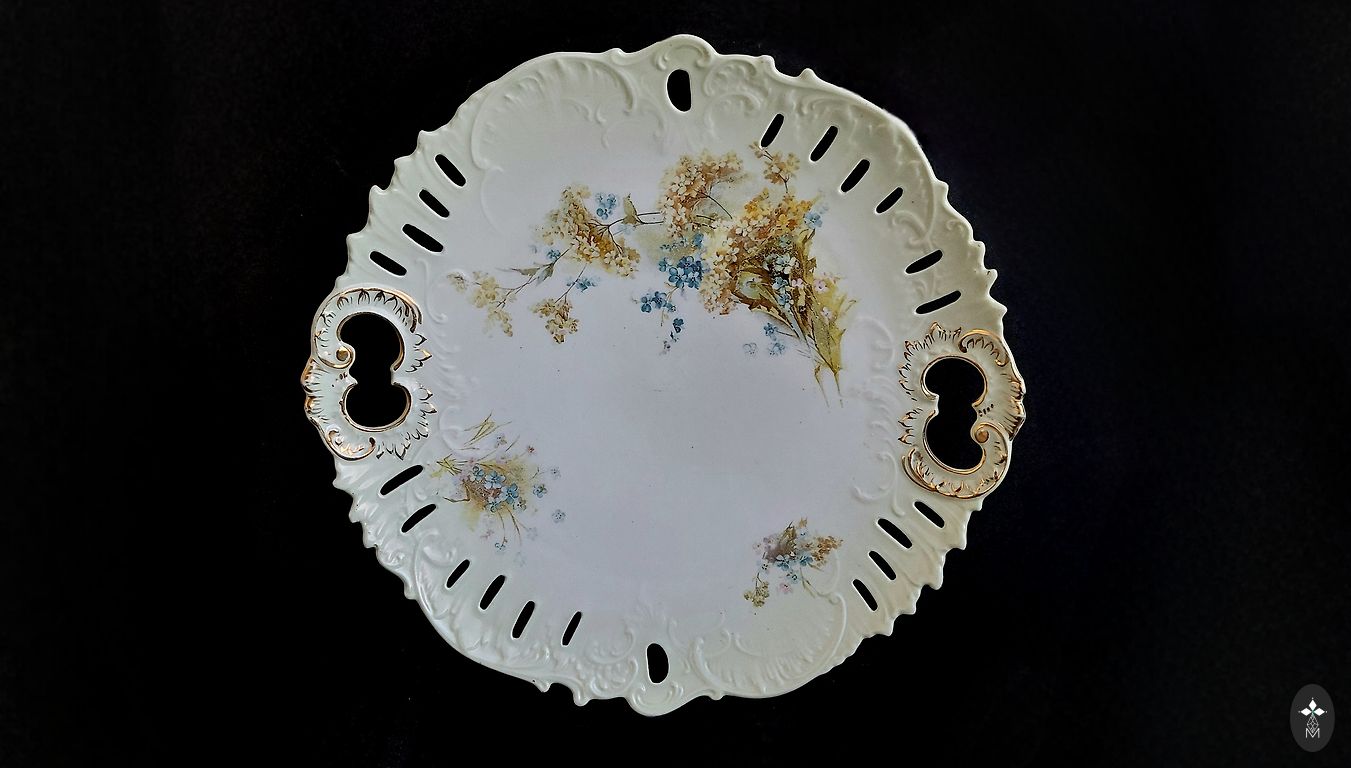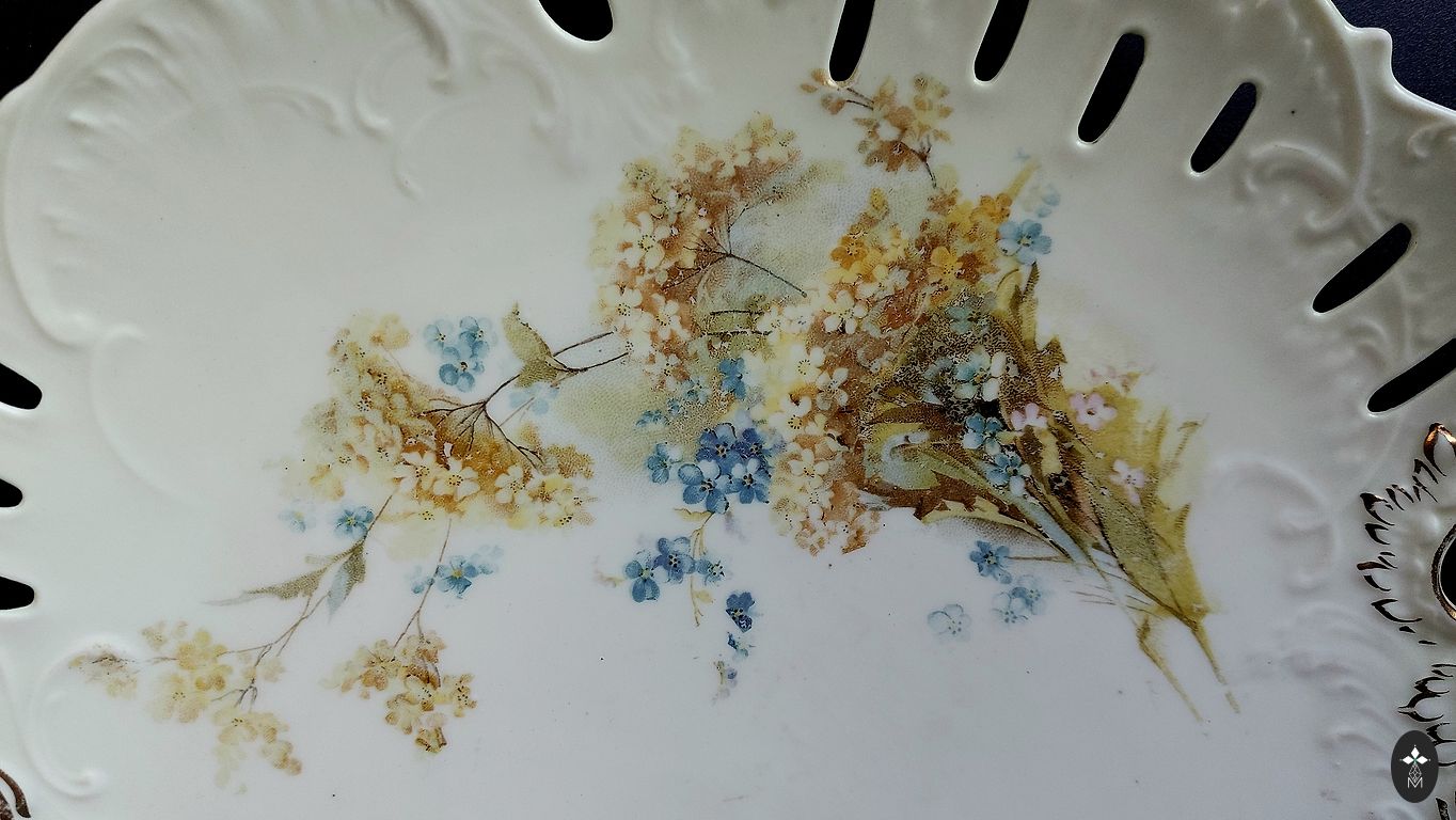 Oval serving dish with embossed pattern, flower bouquets, gold. No defects. Dimensions 25cm x 14cm.
