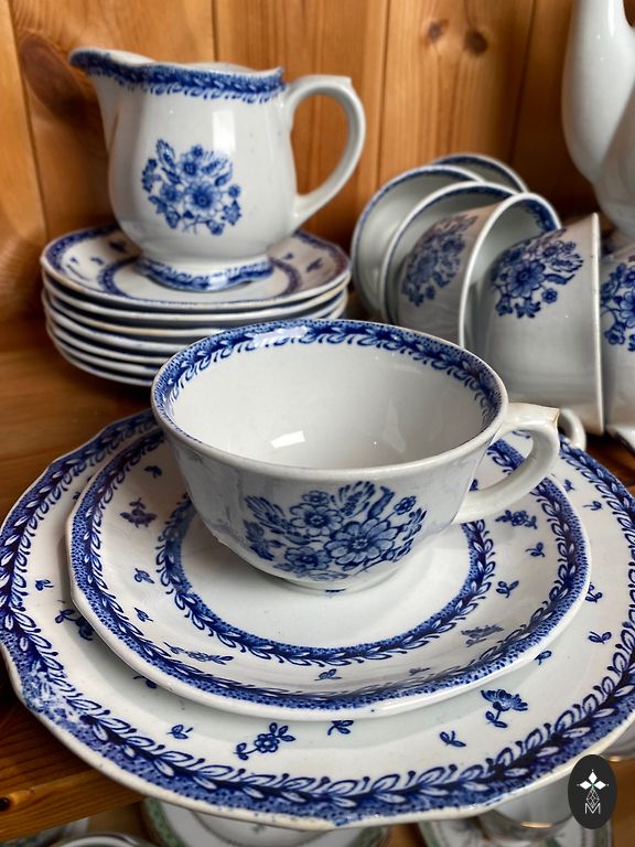 Pārdodu izsmalcinātu Petrus Regout Co Maastricht, sērijas “Castillo” tējas/kafijas trio ar klasisko zilo dekoru (transferware). Trauki datējami ar 20. gs. pirmo pusi (ap 1930–1960).