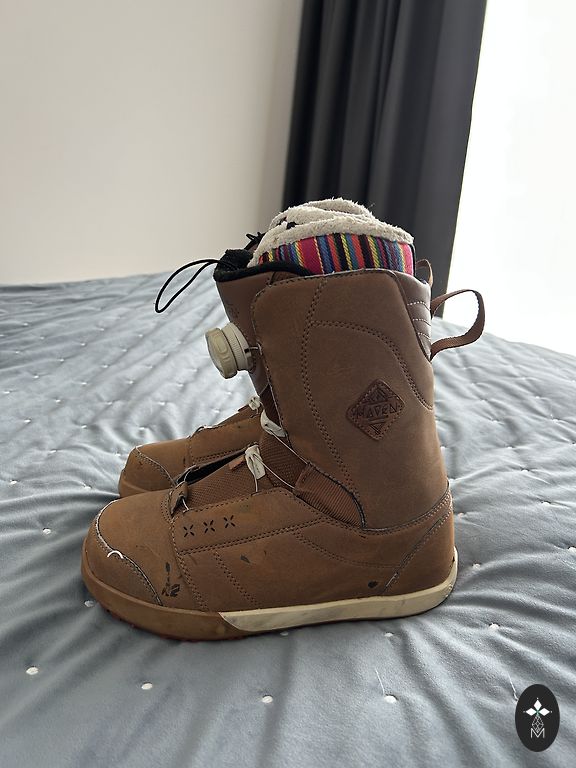 Selling Nitro snowboard boots worn for several seasons. The box indicates size 40, insole 26.5, but in reality, they are size 38. There should be extra room for wearing socks and snowboarding. The right boot has a cut on the toe with an edge, but it does not affect riding.