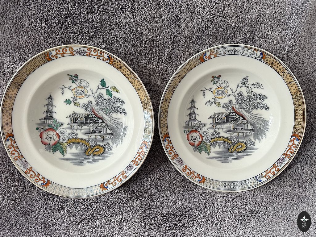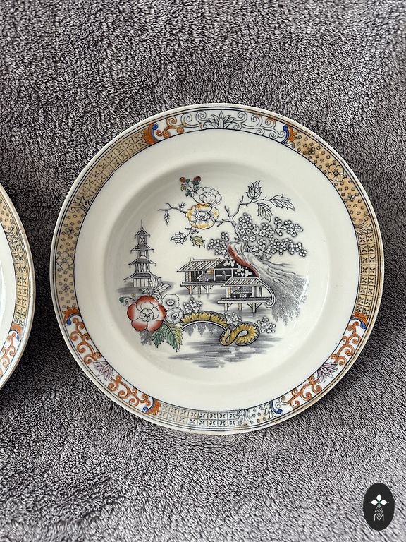 Kai kurių lėkščių auksinis kraštelis galbūt kažkur nusitrynęs, paskutinėje nuotraukoje galima pamatyti
