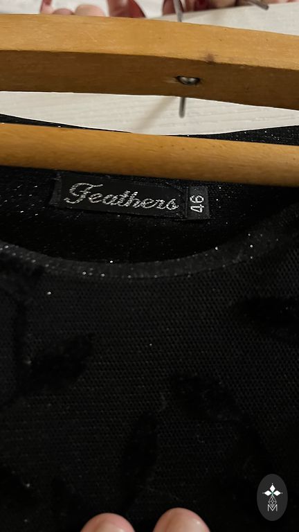 Viskozės suknelė ilgomis rankovėmis su gyvybingu povandeniniu pasaulio raštu. Priekyje iki juosmens paslėpta perlamutrinė sagų eilė. Ilgis 93 cm, nuo pažasties iki pažasties — 52 cm. Nuotraukose suknelė prieš lyginimą. Antra nuotrauka iš VILA išteklių. Jei dėvėtoja nėra labai aukšta, suknelė nėra tokia mini. Pavyzdžiui, 163 cm aukščio dėvėtojai ji būtų iki kelio.