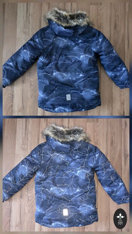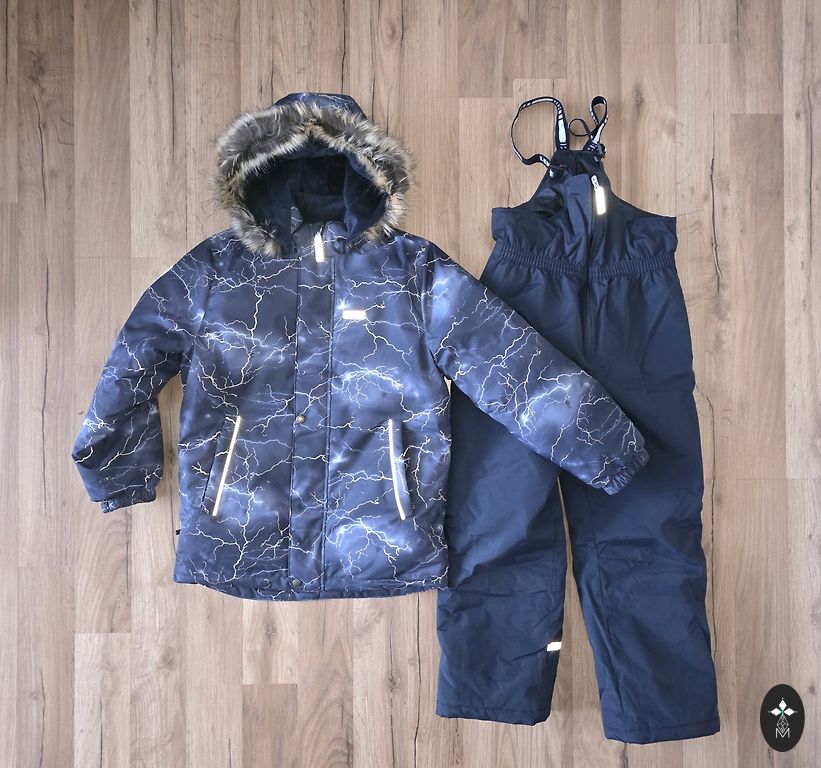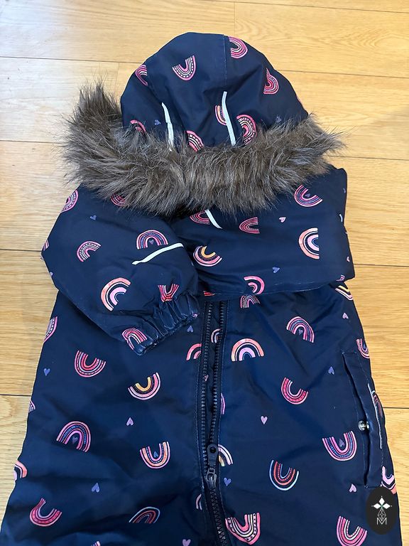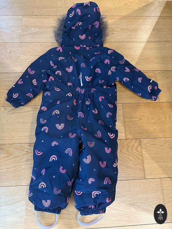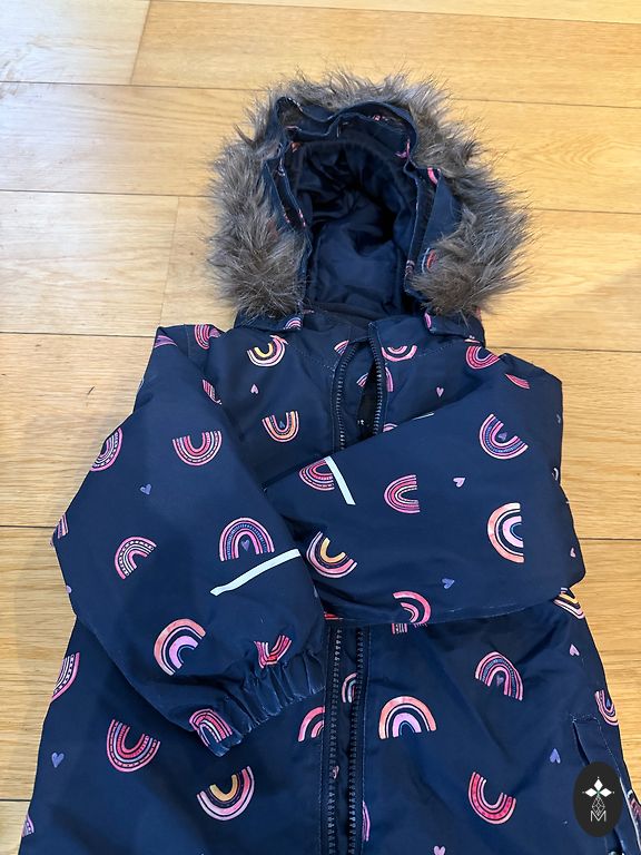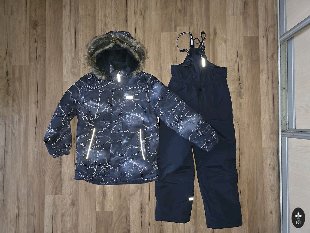 Užpildas: 70% ančių pūkai, 30% ančių plunksnos. Gobtuvas nuimamas, yra dvi kišenės. Užtrauktukas ir velcro - geriausios būklės, gumos ant kojų - be pažeidimų. Kombinezonas neturi skylių, tik nuo plovimo nusidėvėję rankovių ir kelnių kraštai, tačiau tai matoma tik iš arti. Pirktas naujas, gerai tiko 2 sezonus (2-3,5 metų amžiaus).