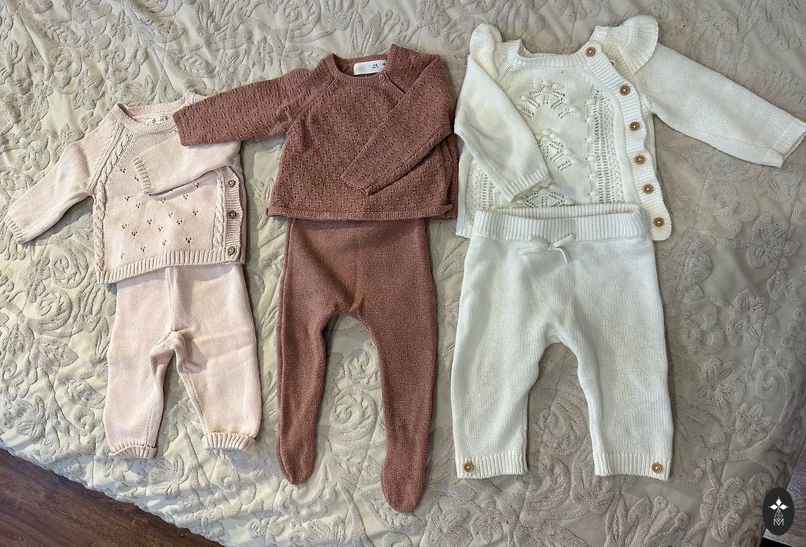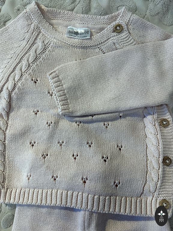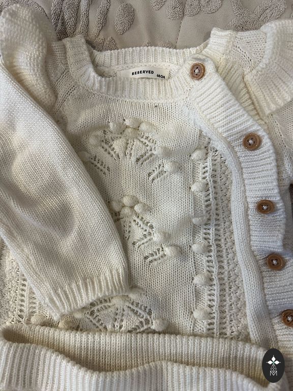 Tamsiai rudas šiltas komplektas - megztinis su aukšta apykakle ir raišteliu, kelnės su kišenėmis, ant gumos. Kelnių ilgis 105 cm. Šilta ir tampri medžiaga - 50% viskozė, 30% poliesteris, 20% poliamidas.