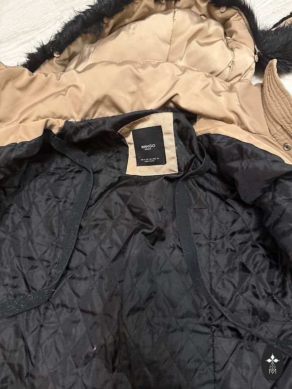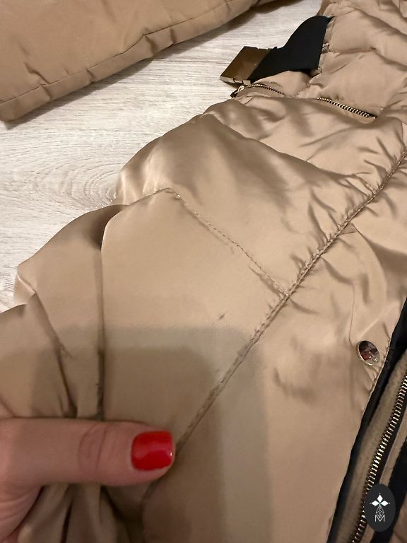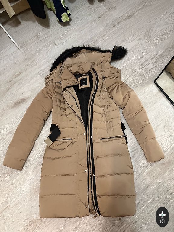 Šilta pūkinė striukė ryškioje orchidėjų spalvoje. Striukė susiaurinta ties juosmeniu, prigludusi prie kūno. Rankovių galuose moteriški raukiniai, kapišonas nuimamas. Krūtinės apimtis 100 cm, juosmuo 80 cm, rankovės ilgis 70-75 cm, ilgis 78 cm. Striukė po cheminio valymo. Siuntimas įskaičiuotas.