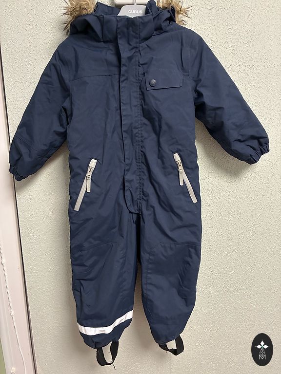 Vieną sezoną dėvėtas žiemos kombinezonas, 98 dydis. Esminių defektų nėra, tik šiek tiek nutrinti keliai (žr. nuotrauką). Juosmenyje guma, tiks liekno sudėjimo vaikui.