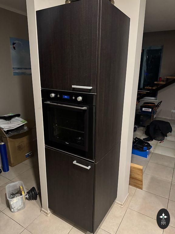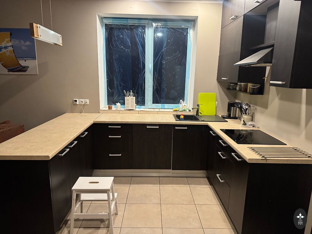 Mažai naudota IKEA virtuvė su blizgiomis durų fasadomis. Komplekte su nauju riešutmedžio tekstūros paviršiumi (be išpjovų)