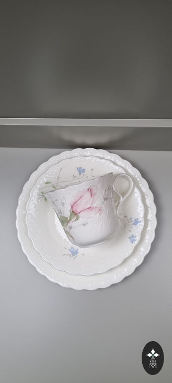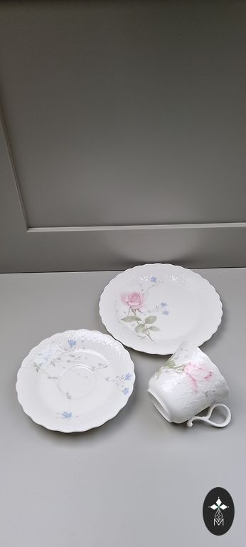Gražus vokiečių August Schweig prieškarinio porceliano kavos trio, geros būklės. Įtrūkimų nėra. Mažas įskilimas ant lėkštės pagrindo (žr. paskutinę nuotrauką) negadina bendro vaizdo ir netrukdo naudoti. Puodelis 160+ ml. Dramblio kaulo spalvos glazūra. Atlaisvinu spintą.