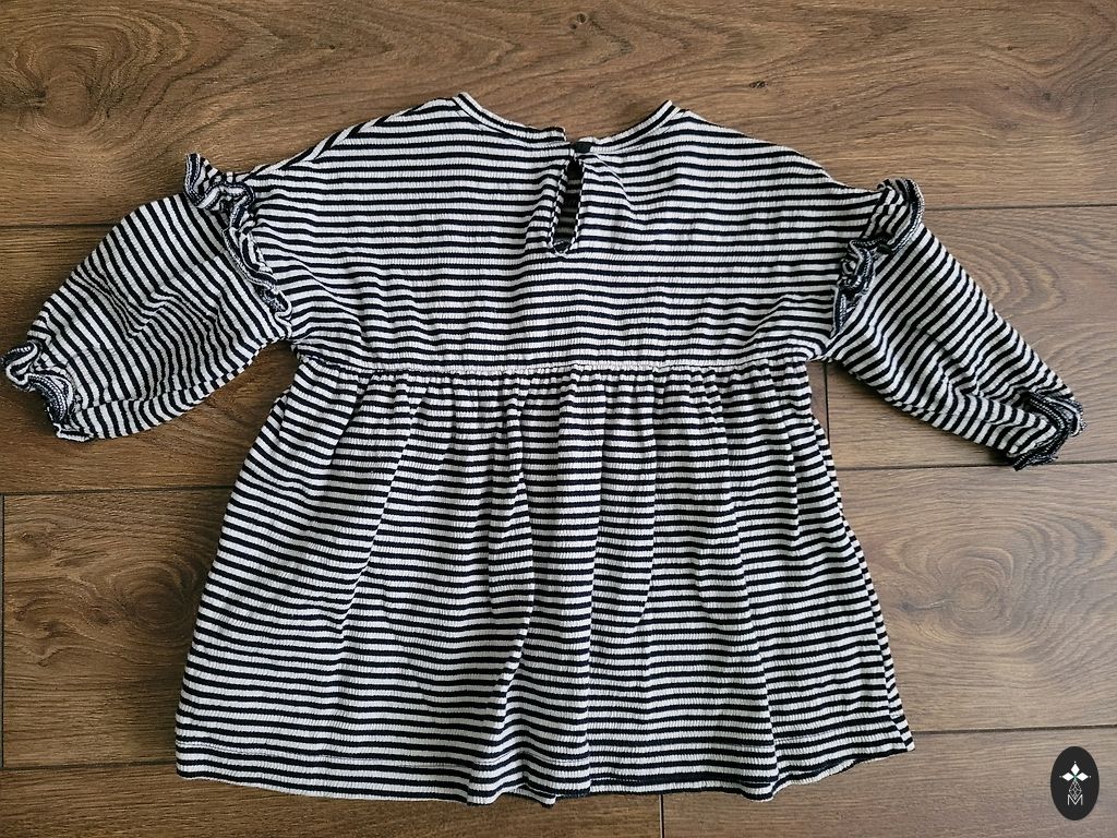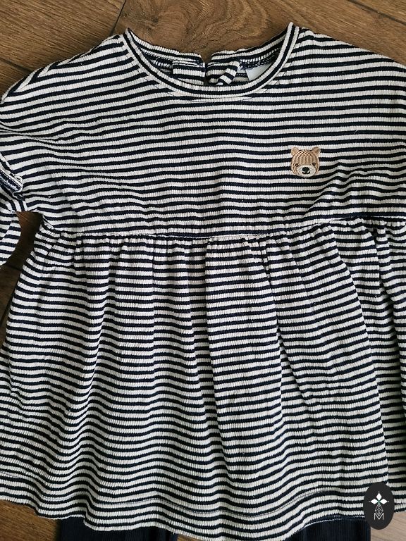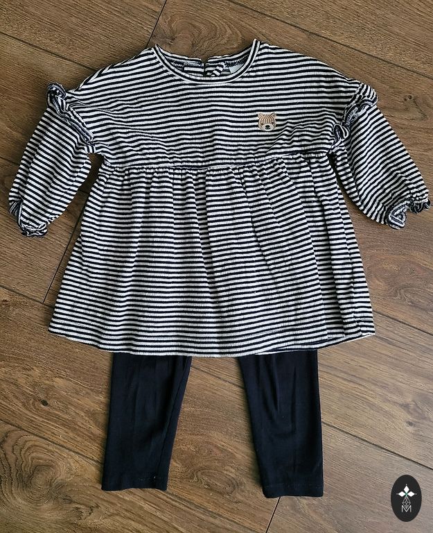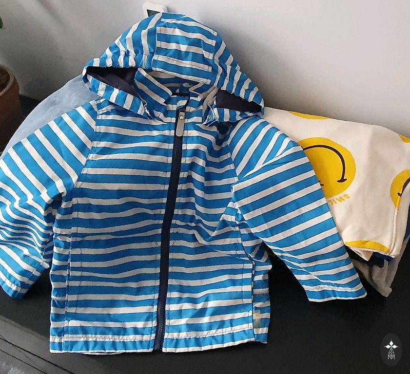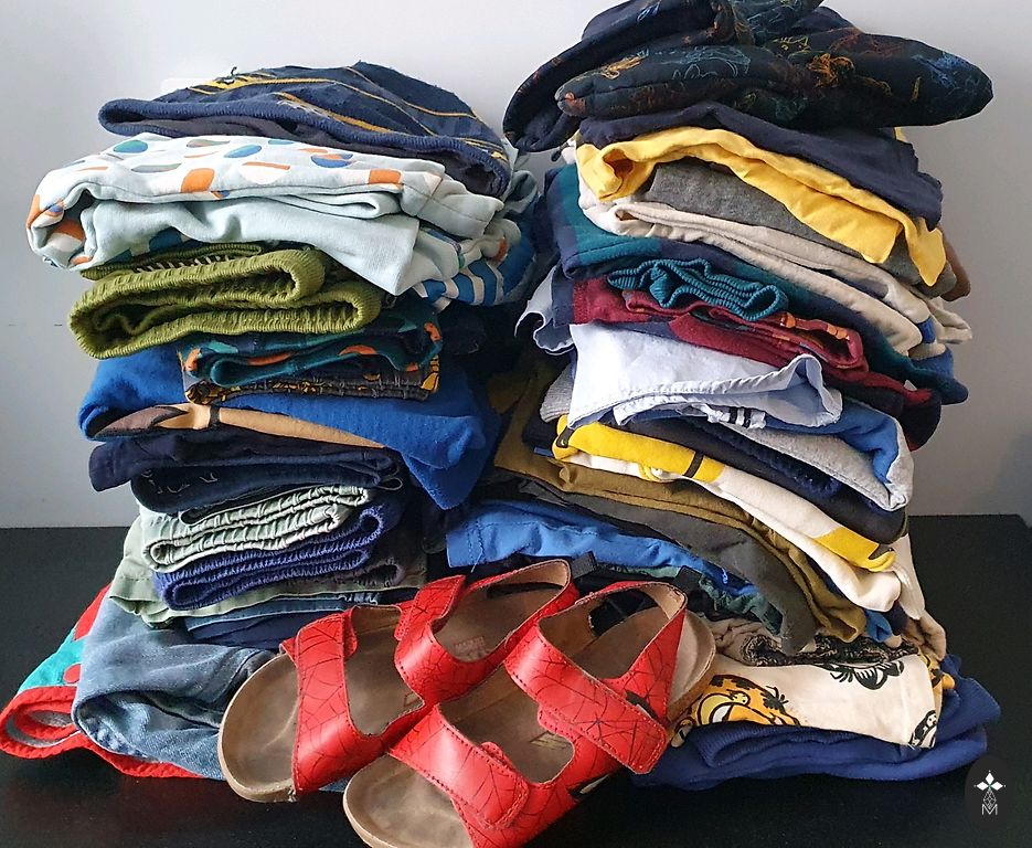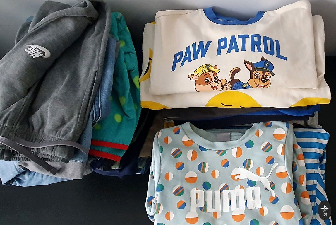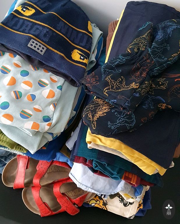 Įvairūs drabužiai (marškinėliai, megztiniai, pižamos, bodžiai, kojinės, pėdkelnės, kepurės, viena plona striukė, kita šiltesnė striukė, bet šią sakyčiau 74 dydžio, batukai.