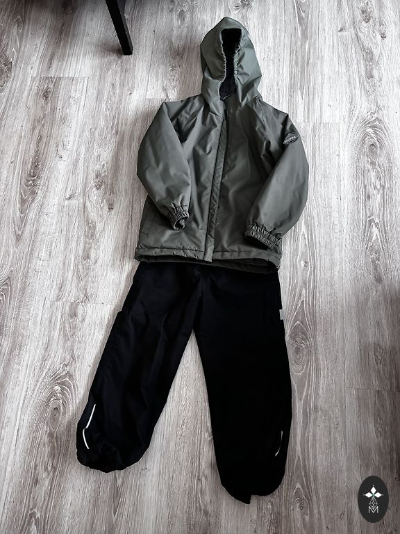 Tarpsezoninis kombinezonas 116/122, mes nešiojome ir žiemą. Ant kojos yra mažas baltas dėmelis, kaip matoma nuotraukoje, nėra guminių batų.
