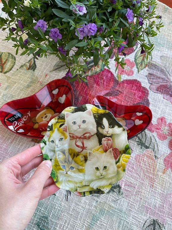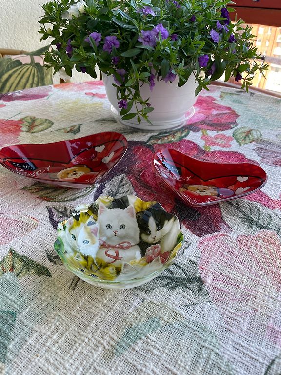 Viena lielāka bļoda, diametrs 23 cm, un 2 mazākas bļodiņas, 15 cm diametrs. Var mazgāt trauku mašīnā un likt miktoviļņu krāsnī. Lieliskā stāvoklī.