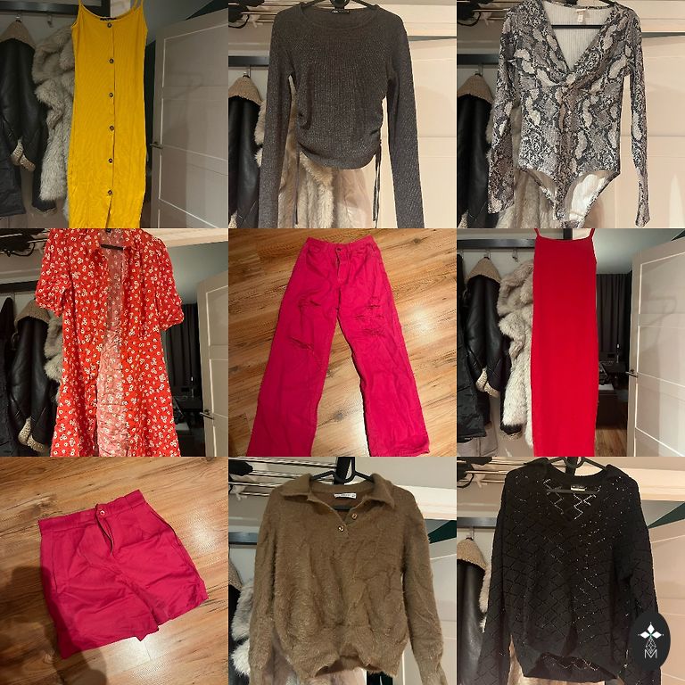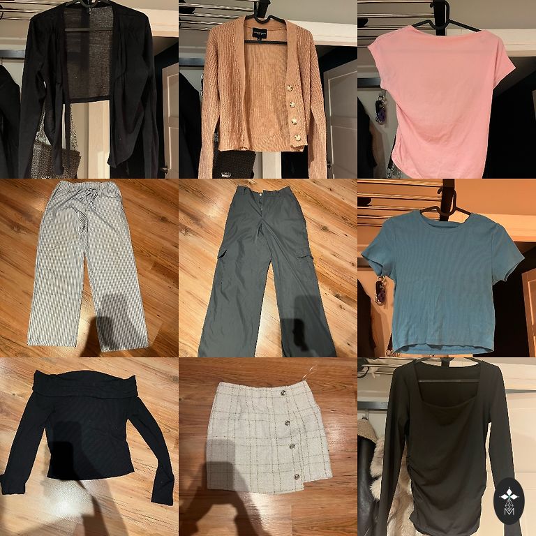 Б/у, но еще хорошие. Юбка из тюля, легкая, нейтрального цвета, подходит ко всему. Пояс на резинке. Полосатое платье от H&m из эластичного материала, надевалось немного. Темное платье от Reserved, размер xs, но также подходит на s. Надевалось один раз. Серые брюки с широкими штанинами, классические, очень удобные, также из эластичного материала. Футболки носились больше, но все еще хорошие.