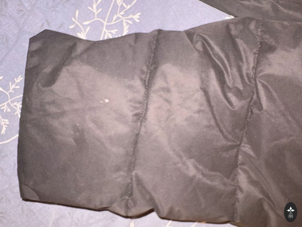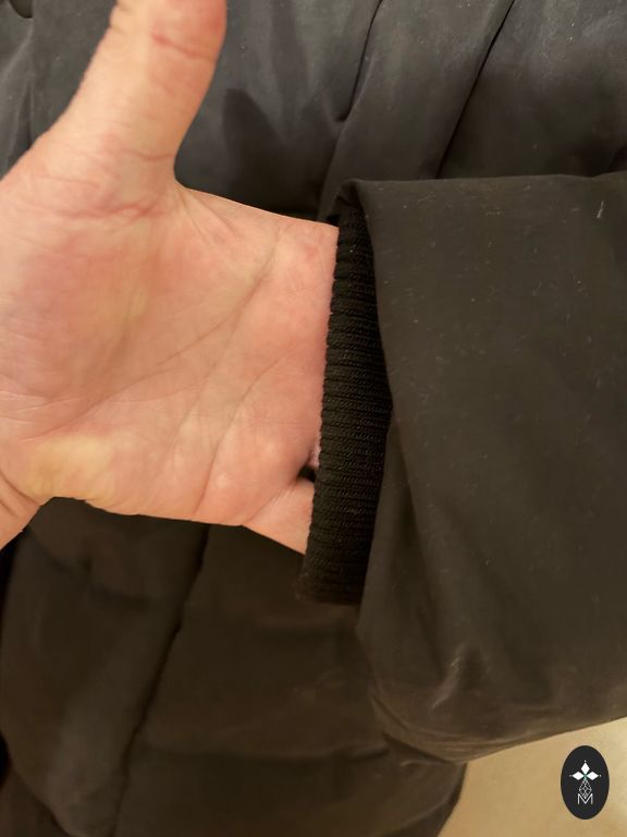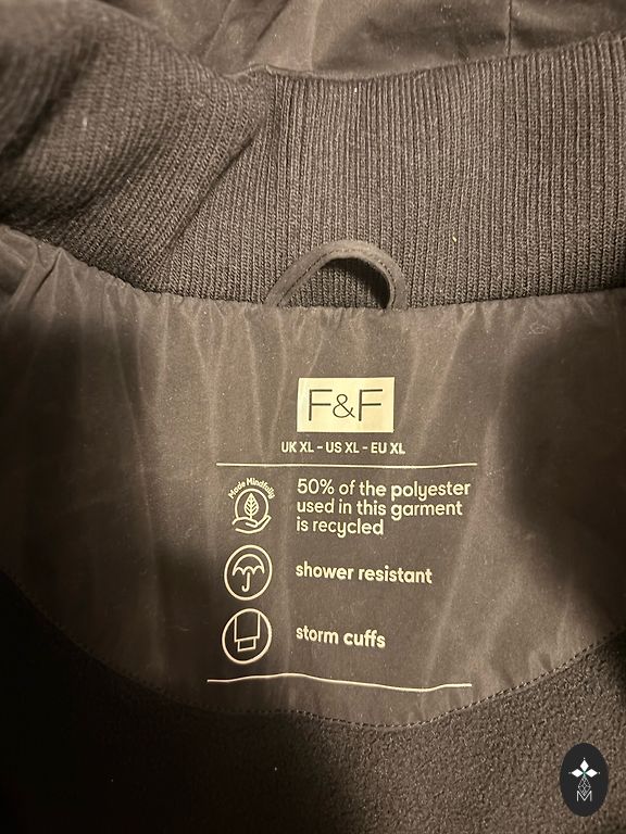 Vandeniui atsparus, dvipusis užtrauktukas, gilios kišenės siūlėse su užsegimais, stovinti apykaklė, rankogaliai su megztu apdaila ir skylute nykščiui. Ilgis 117 cm, rankovių ilgis 64 cm (be manžetės), plotis pečių srityje 50 cm. Rekomenduoju aukštoms moterims. Nešiojau L; XL, bet buvo per didelis.