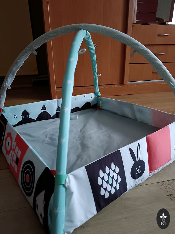 TROLL lopšelis / lovytė. Jį šiek tiek apgadinojo šinšila (matoma nuotraukoje), tačiau tai niekaip nepaveikė lovytės naudojimo. Lopšelį galima užblokuoti, kad jis nesūpuotų.