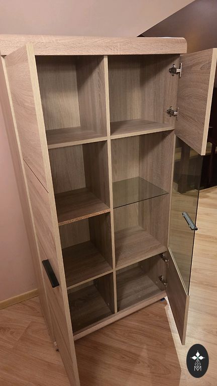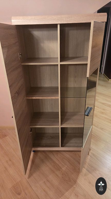 Atverams uz abām pusēm, stikla plaukti, iestrādāts apgaismojums un rozete.