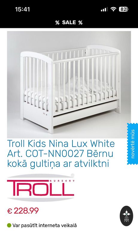 Bērnu gultiņa TROLL. Viena siena nolaižama. Uz ritenīšiem, kurus var noņemt. Ir nelieli defekti (skrāpējumi). Komplektā matracis, maliņa (attēlā), 2 ūdensnecaurlaidīgas palagi un divi kokvilnas palagi ar gumiju.
