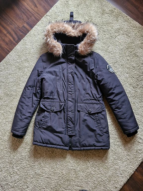 На талии есть регулируемые шнурки (кулиска), которые позволяют подогнать куртку по фигуре. Имеются практичные карманы на молниях. Благодаря длине (90 см) куртка отлично сохраняет тепло и обеспечивает комфорт при ходьбе.