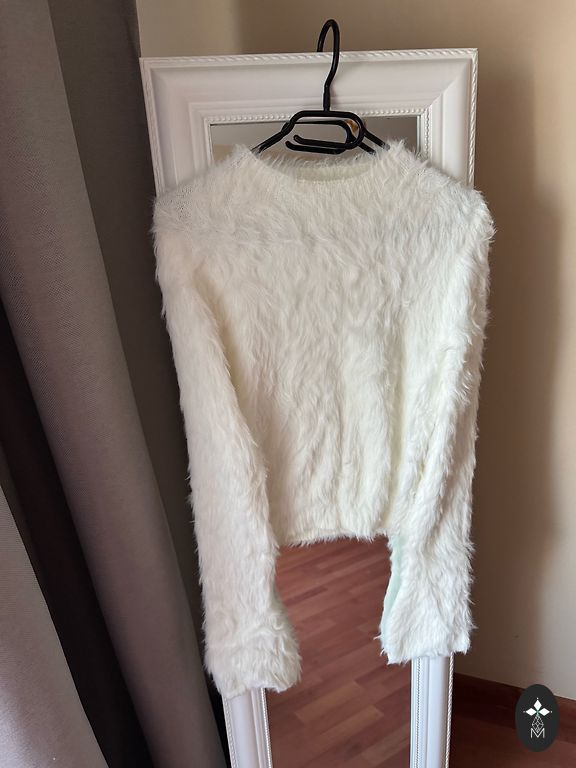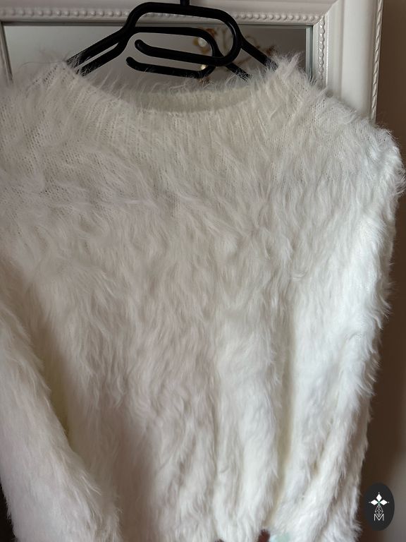 Kūdikių alpakos megztinis, pieno spalvos, krūtinės apimtis 104 cm neištempus, liemuo 100 cm, ilgis 52 cm, rankovės nuo kaklo dalies 73 cm.