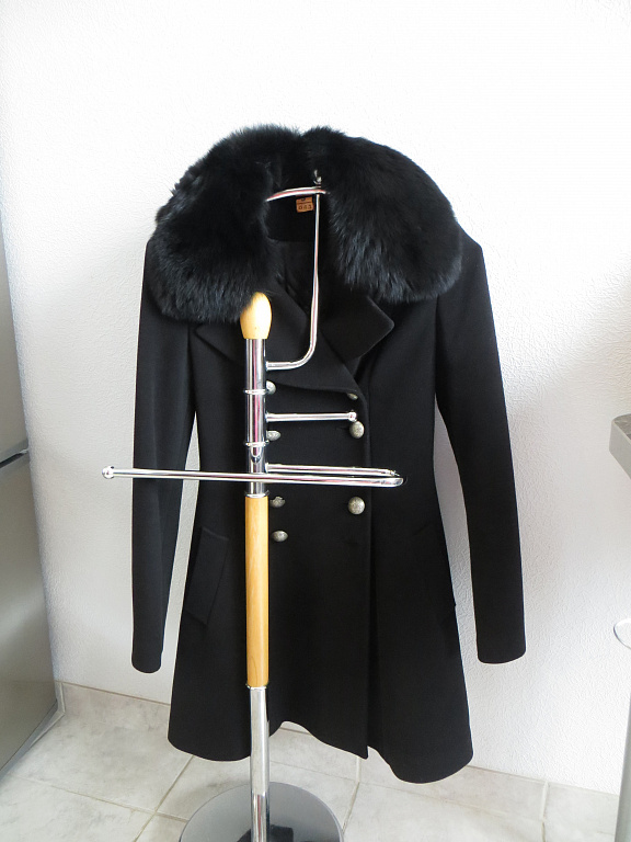 Sultinga, juoda spalva. Uždarymas, sagtys viduje. Tinka rudeniui, pavasariui. Kirpimas šiek tiek statinės formos. Ilgis nuo peties 90 cm, rankovių ilgis 62 cm.