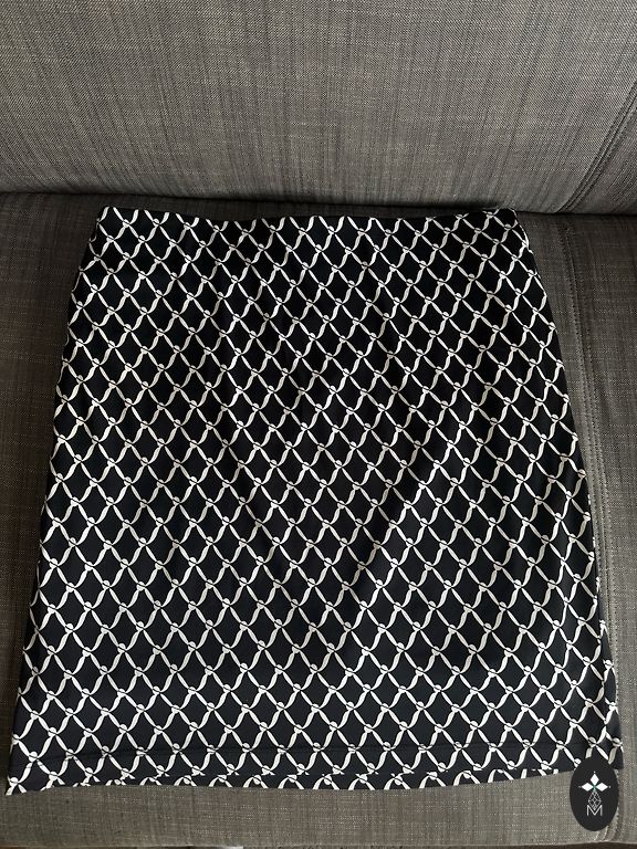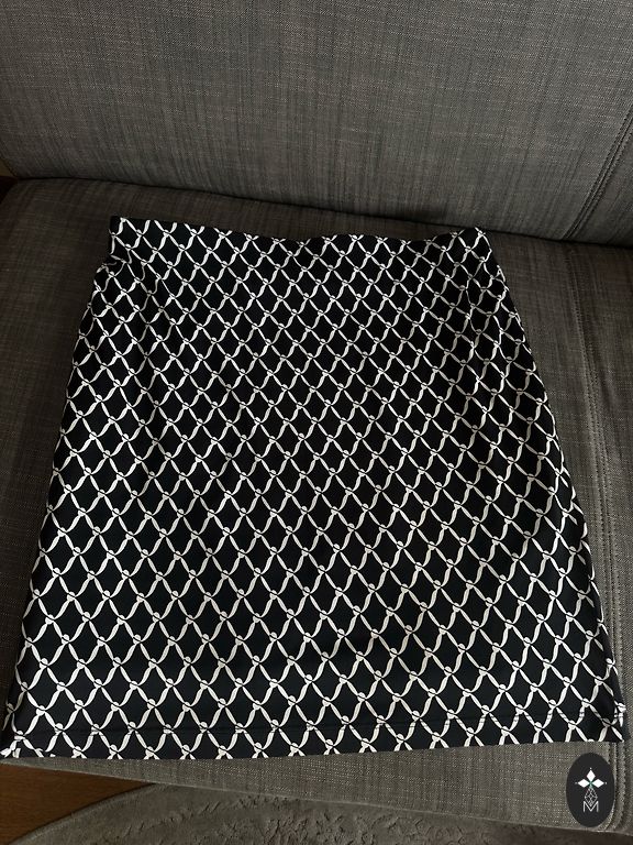 Rantuoti šifono sijonai su spalvotu raštu - juoda su raudonais taškeliais. Yra pamušalas. Ilgis 78 cm, juosmens be tampymo 86 cm.