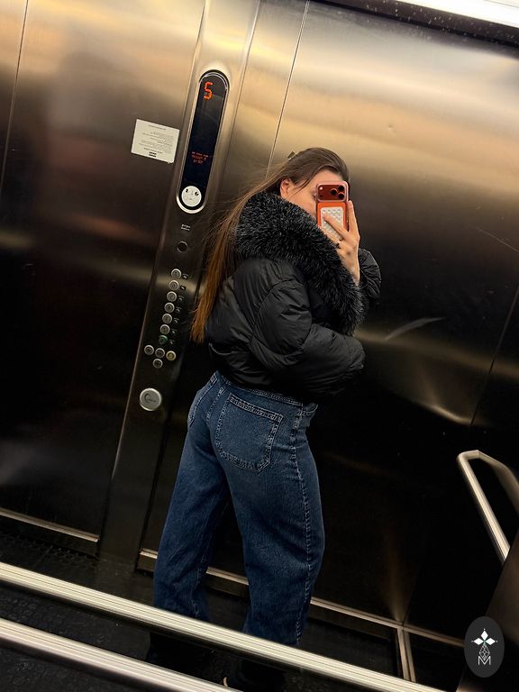 The jacket is very warm, suitable for temperatures down to -30. The outer material is wool, and the inner material is down. The collar is natural and can be removed. The jacket has pockets. It will also fit a larger size.