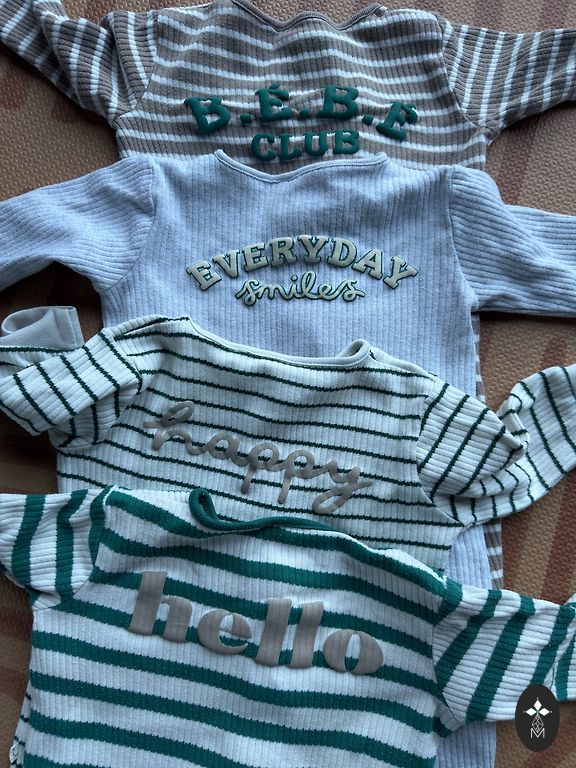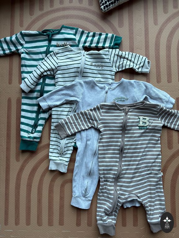 Бежевая кофта NEXT milk club 62см 0-3 (подходила значительно дольше), синяя кофта - GAP, 0-3 мес, указано 50см, но размер как у бежевой. Зеленый свитер NEXT 68см 3-6 мес.