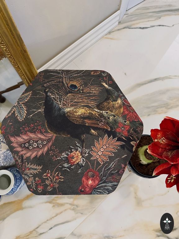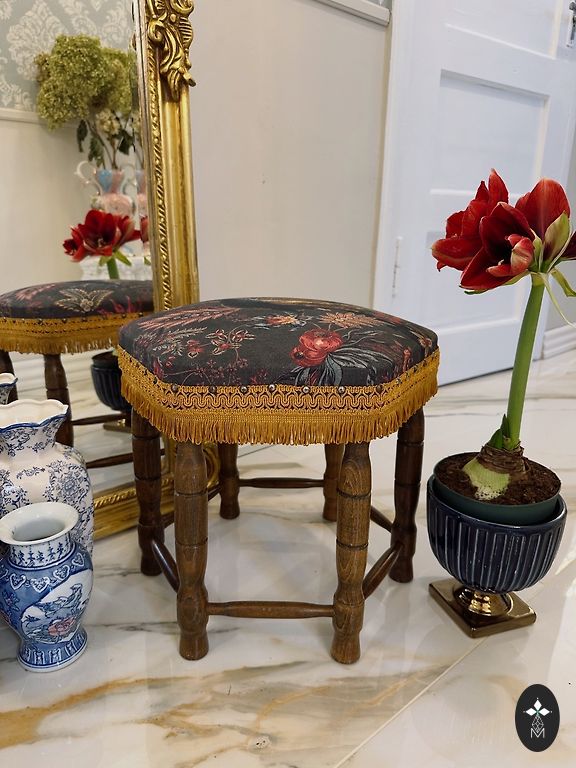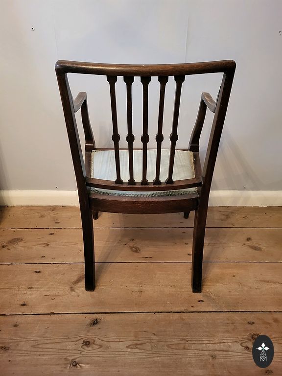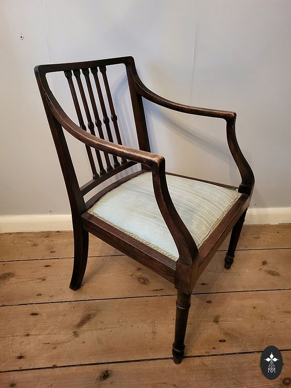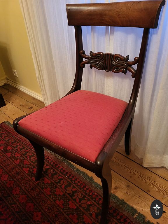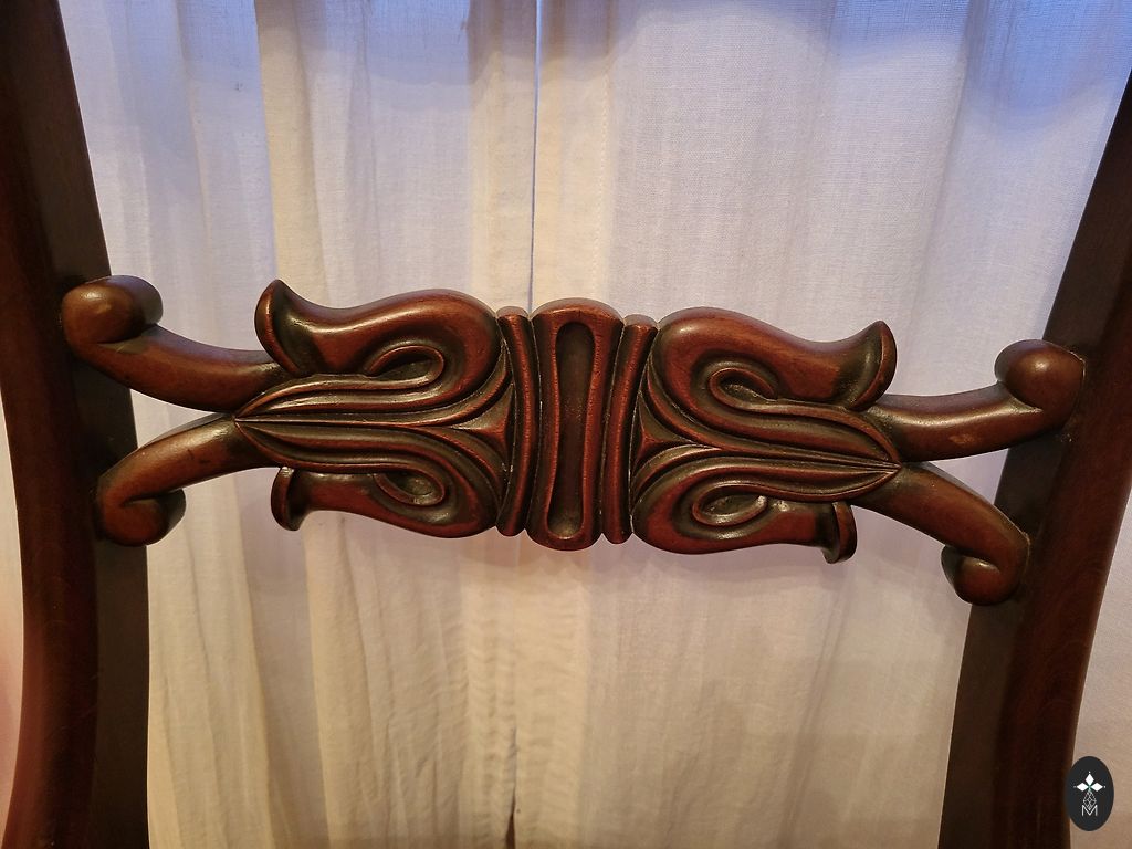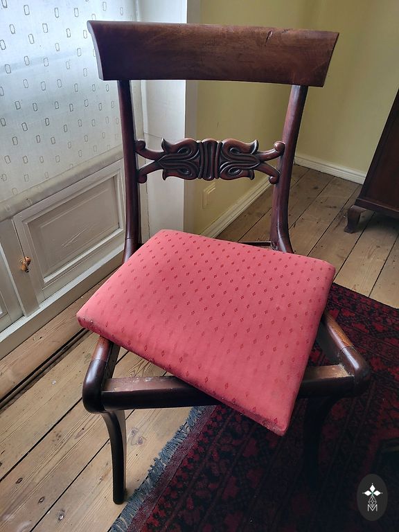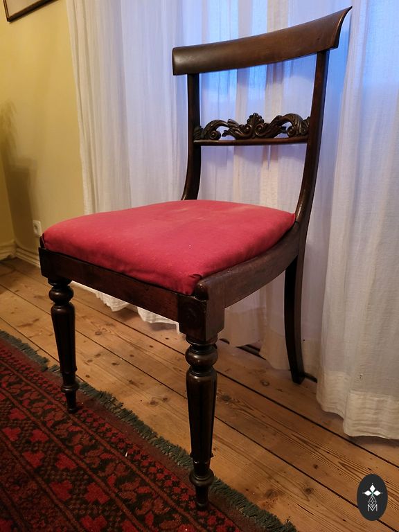 Kėdė pagaminta iš medžio. Aptraukta zomšiniu audiniu. Smulkiai išraižytos detalės.