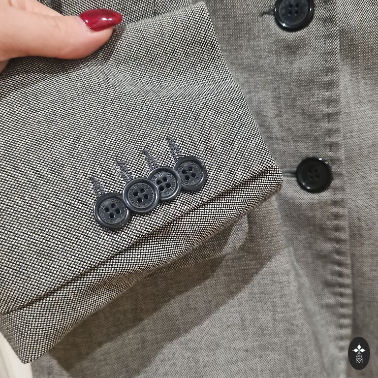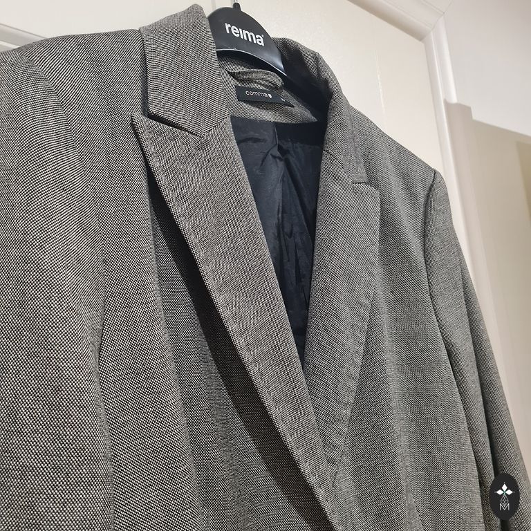 Tamsiai mėlynas navy spalvos švarkas.