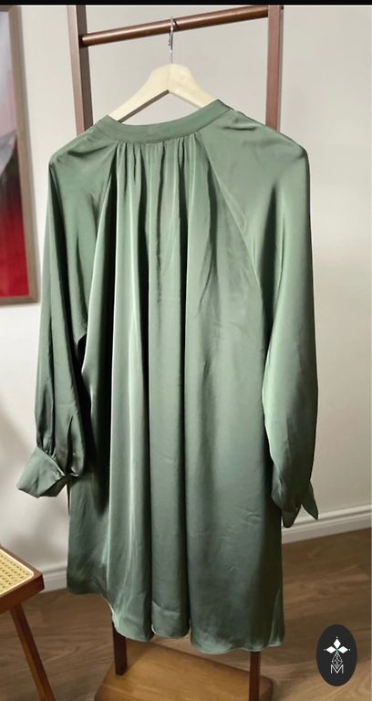 Brīva piegriezuma kleita, perfektā stāvoklī, M izmērs, bet noteikti derēs arī L, labi krītošs audums, apakšpusē volāns, aizdare ar podziņu aizmugurē. Garums 106cm, padusēs platums 55cm, gurnos platums 66cm