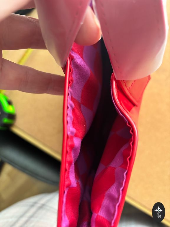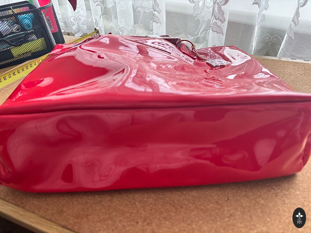 Labai graži, nedidelė raudona rankinė su mažu veidrodėliu, gali būti naudojama kaip nedidelė kosmetinė.