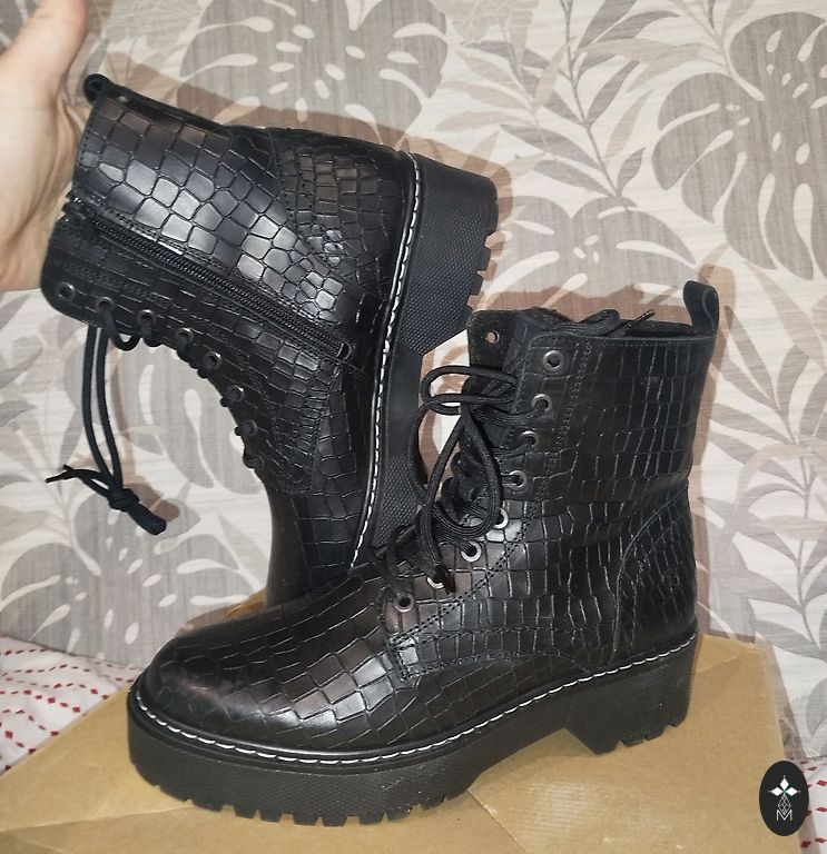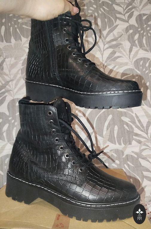 New leather boots size 40 with thick lining inside. Made in Cambodia. Fastened with a zipper. Thick sole 2cm. Heel 4cm. Insole 26cm. Suitable for wider feet with higher arches. Boot length from the floor 25cm.