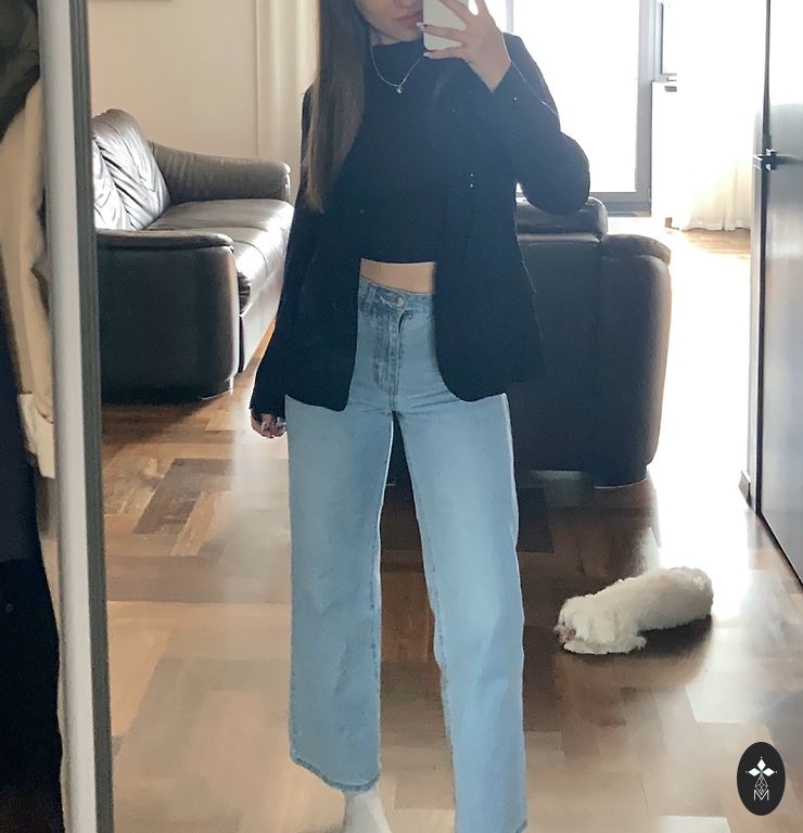 Lengvo audinio, laisva „švarkas“ be sagų. Ilgis šiek tiek virš klubų. Tinka M/L dydžiui.