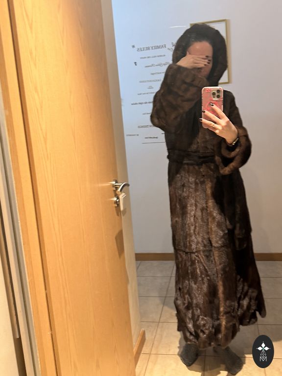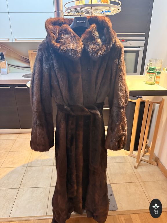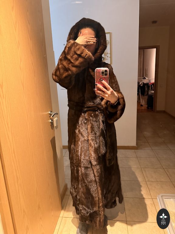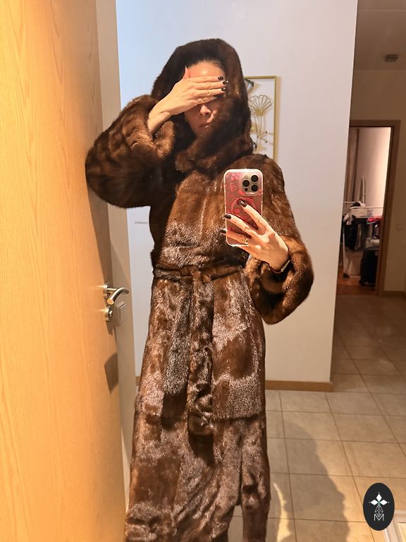 Pailgintas (130 centimetrų) moteriškas audinės kailis iš sveikų odelių, rudos spalvos, 46 dydis su gražiu ir šiltu gobtuvu ne tik pasivaikščiojimams palei jūros krantą ❤️