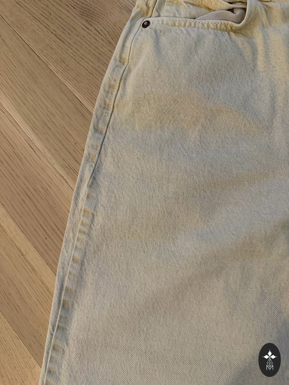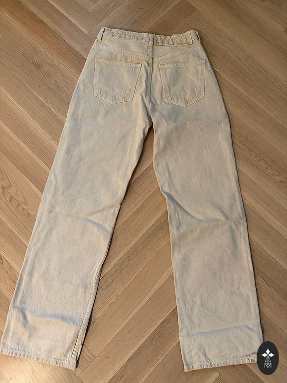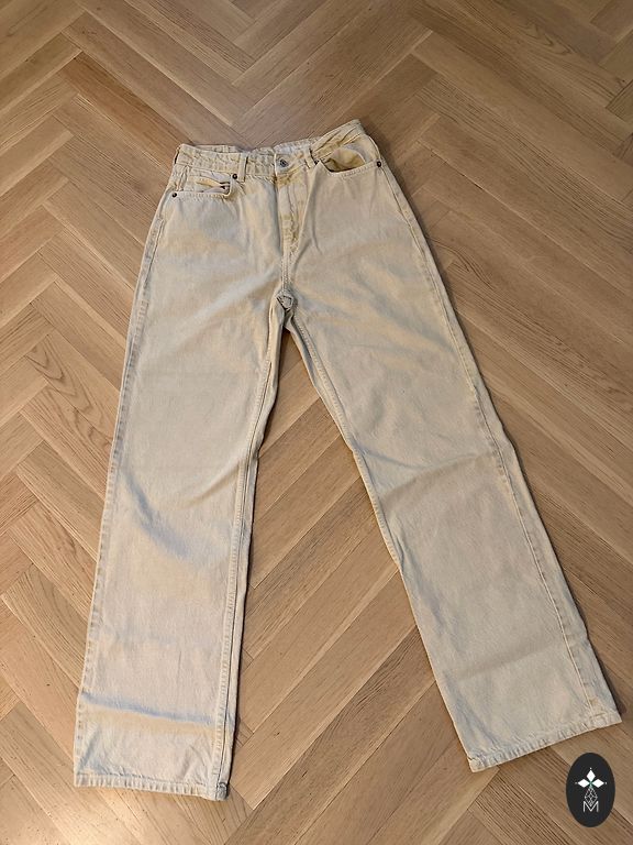 Vidutinio aukščio, tiesūs džinsai. 40 dydis. 70 cm juosmuo, ilgis 103 cm.