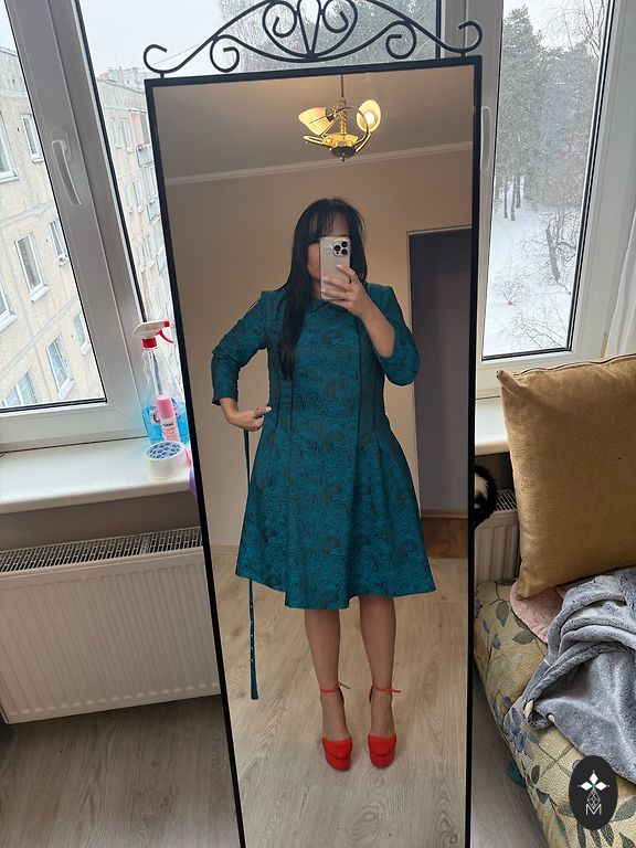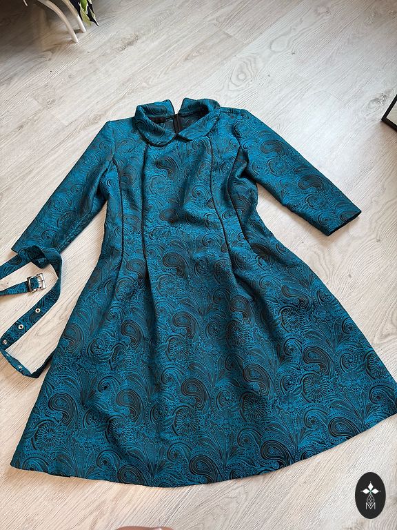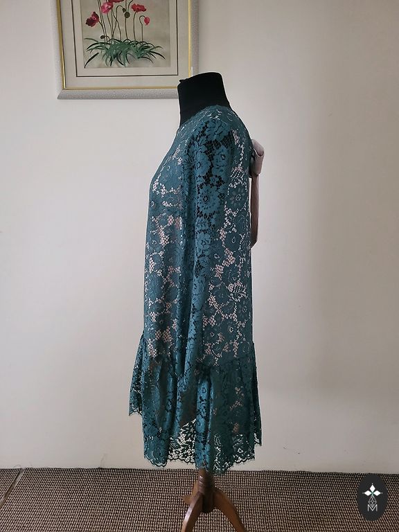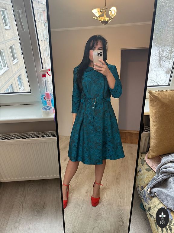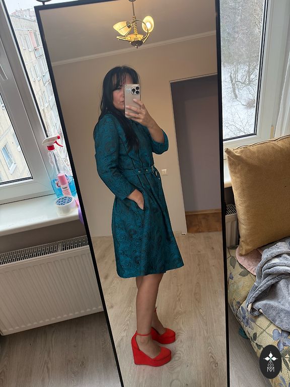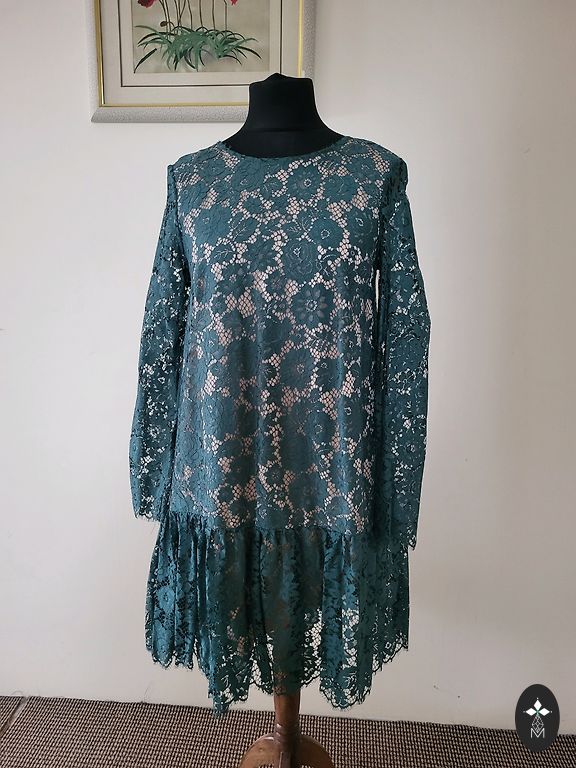 Graži ilga suknelė. 130cm. Krūtinė 53+2. Liemuo 55×2cm. Sijono apačia klostuota. Užpakalyje užtrauktukas. Rankovės ilgos, su elastine juosta galuose.