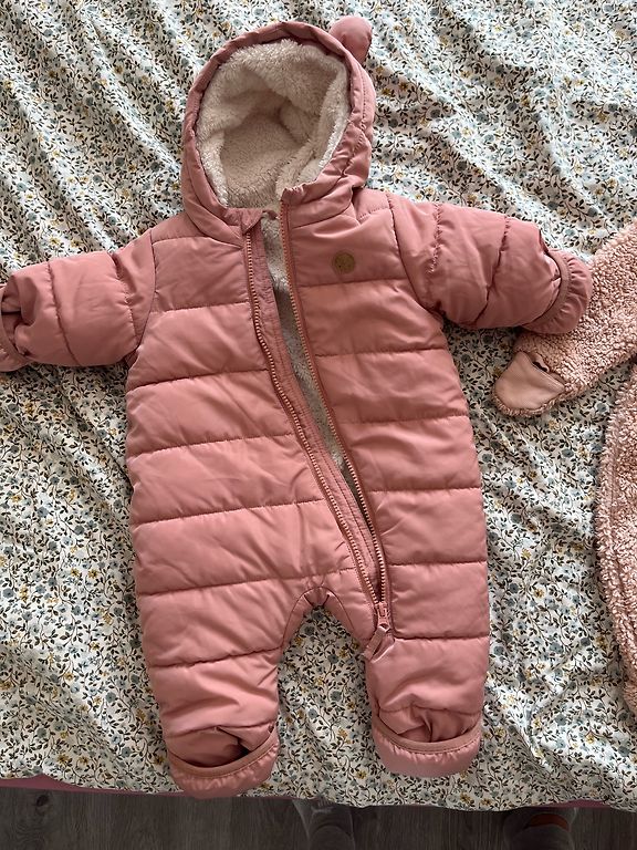 The coverall is resistant to various weather conditions and provides warmth thanks to its insulated interior. It features a removable hood, elastic cuffs at the sleeve ends and hem. There is a zipper at the front, and reflectors on the shoulders enhance safety. BIONIC-FINISH ECO technology ensures water and dirt repellency, maintains color longer, allows fabric to dry quickly, withstands active use, is breathable, and weather-resistant. There are minor visual defects. It fit my daughter until she was 2 years old.
