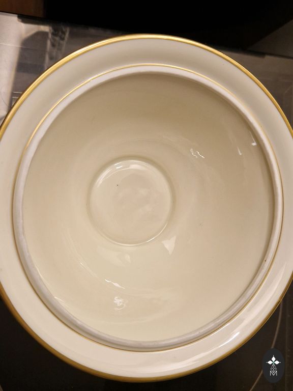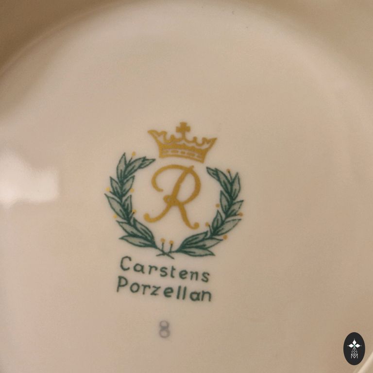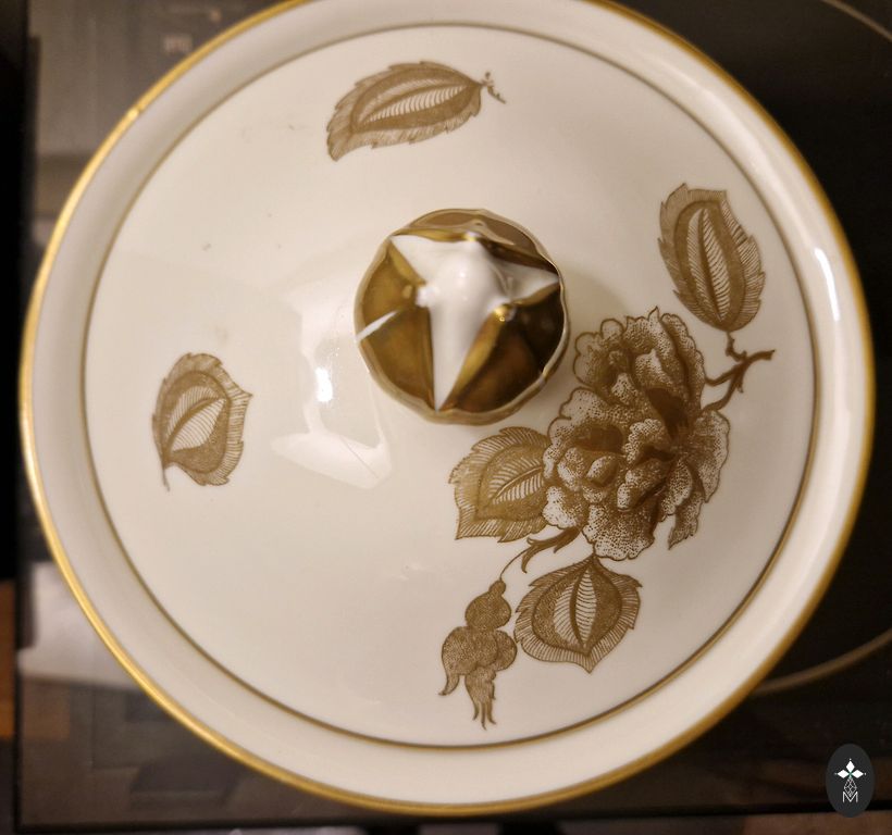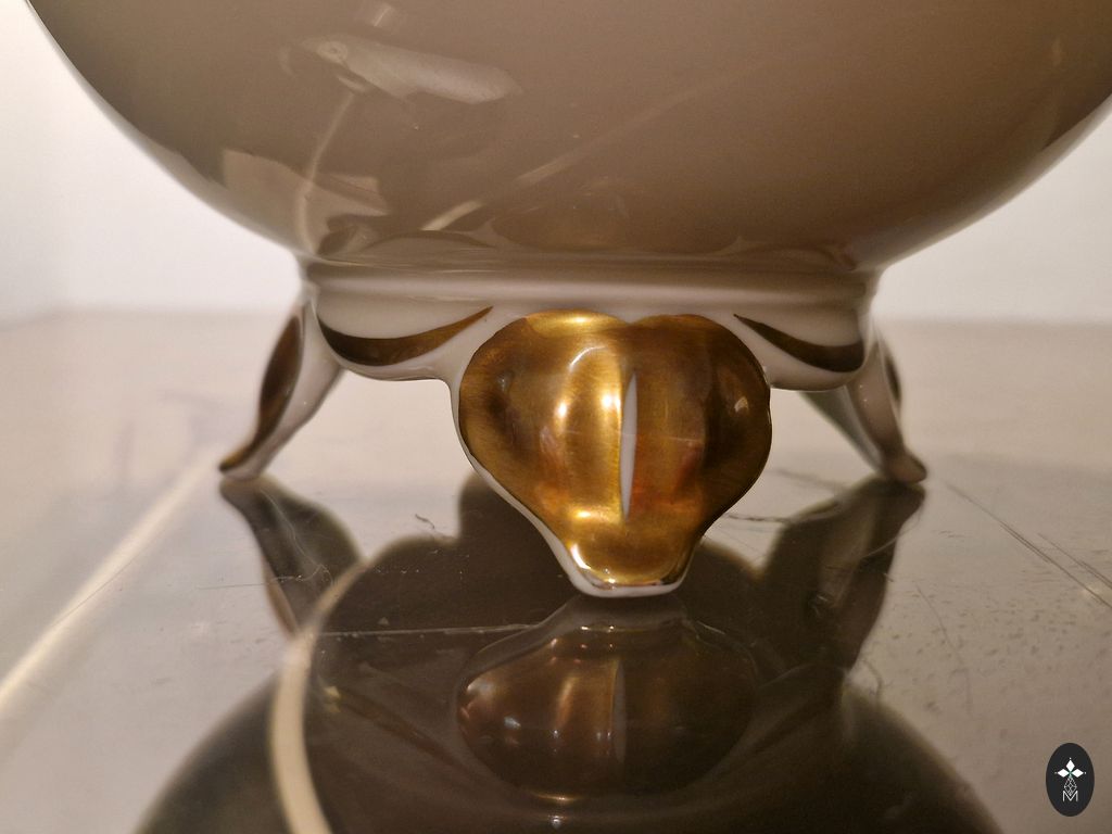 Vokiškas vintažinis porceliano indas ant kojelių (tikėtina, Dönner & Co. iš Bavarijos), pagamintas XX a. antroje pusėje, Drezdeno/rokoko stiliumi. Gražus, kokybiškas vintažinis daiktas. Rožės sveikos, auksas kaip ką tik užteptas. Indo skersmuo 20 cm, aukštis 9 cm. Užrašas Handarbeit (rankų darbas) indo apačioje nėra tik rinkodara.
