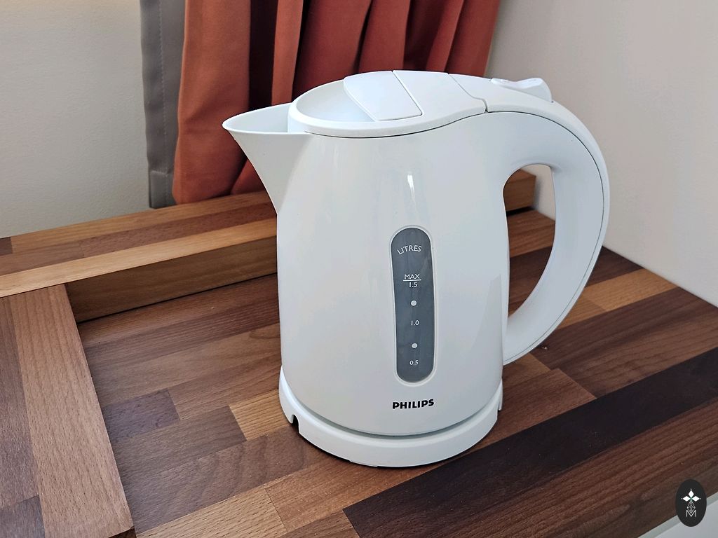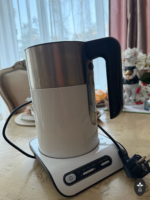 The kettle is equipped with a Strix controller, double walls, and protection against overheating when operating without water.