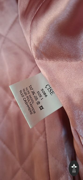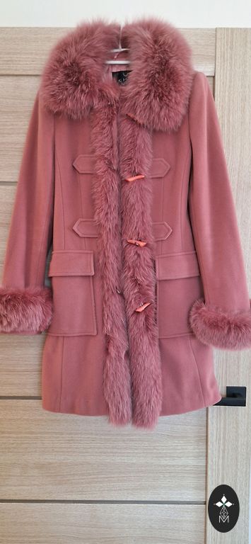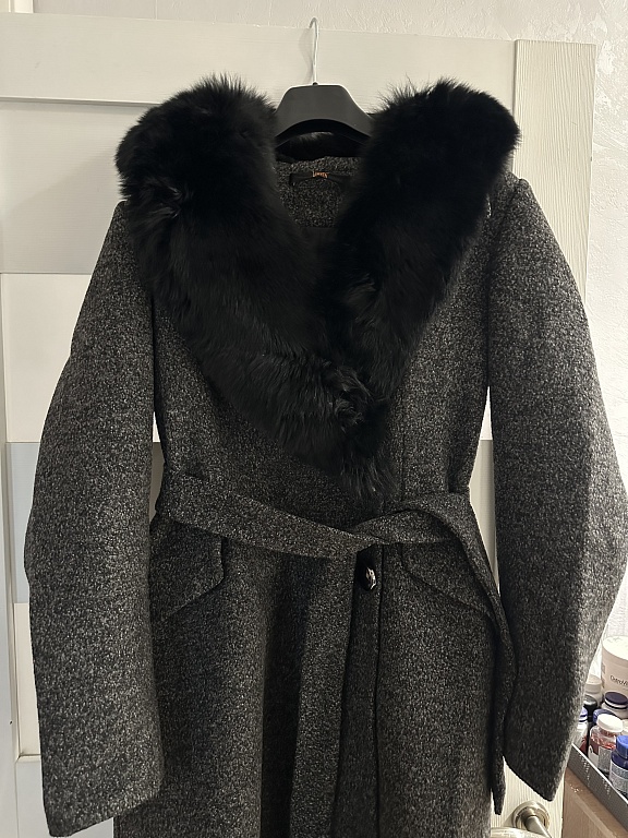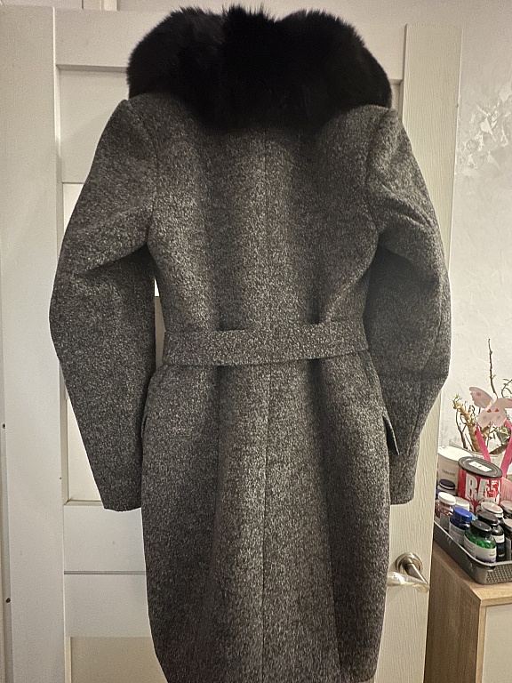 Wool coat, worn only a few times, didn't become friends. It is in shape, the picture cannot show, but the waist is slightly narrower. 41% wool.