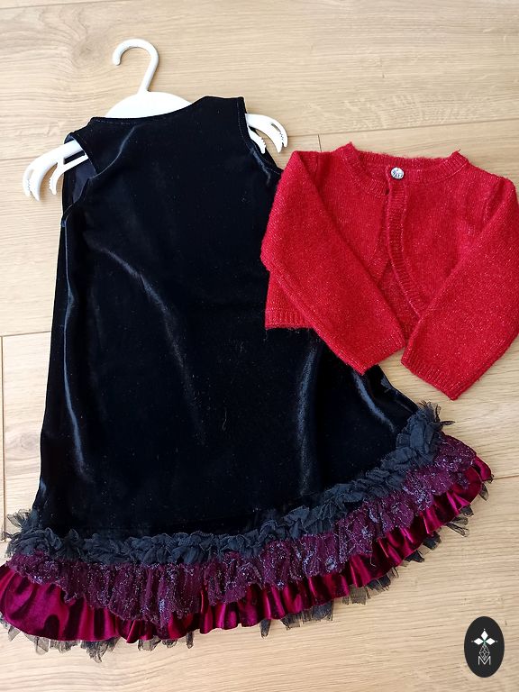 Melna samta kleitiņa ar aktuālajiem spīdumiem šajā vecumā.Rokas 3/4 ar rišiņām.Derēs 5-6 gadu vecumam.