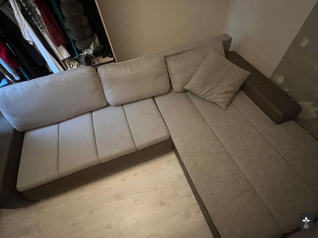Didžiausia sofa yra ištraukiama - lovos dydis 135 x 180 cm. Papildomai galiu padovanoti du vienvietius klubinius krėslus (kai kur audinys atrodo nusidėvėjęs, todėl atiduosiu nemokamai).