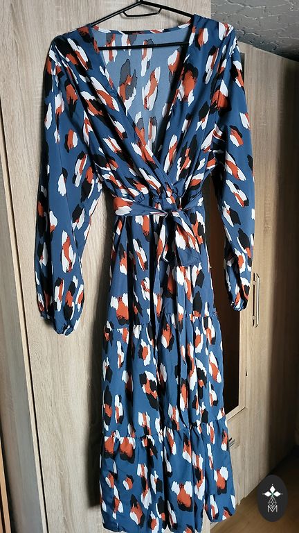 Graži, labai patogi suknelė su V formos iškirpte. Dėvėta vieną kartą, dabar daugiau stovi spintoje. Suknelės etiketėje nurodytas dydis 42, tačiau ji nėra didelė. Audinys tamprus. Merginai, dėvinčiai L dydžio drabužius, tiks. Bendras suknelės ilgis yra 97 cm.