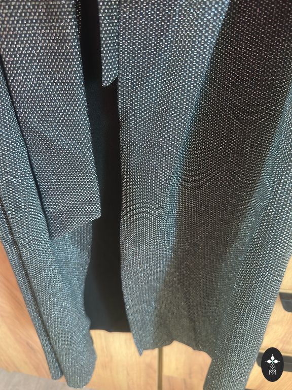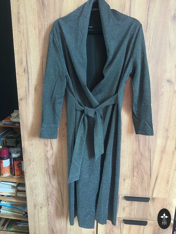 Faina prekės ženklo megzta suknelė M/L dydžio su blizgučiais ant rankovių. Rankovės platokos. Ryškus V formos iškirpimas dekoltėje ir nugaros dalyje. Suknelė nuo pečių nenuslysta, nes nugaroje ją jungia juostelė. Suknelė yra 107 cm ilgio, nedidelis skeltukas 17 cm kairėje pusėje. Suknelė yra taupe spalvos.