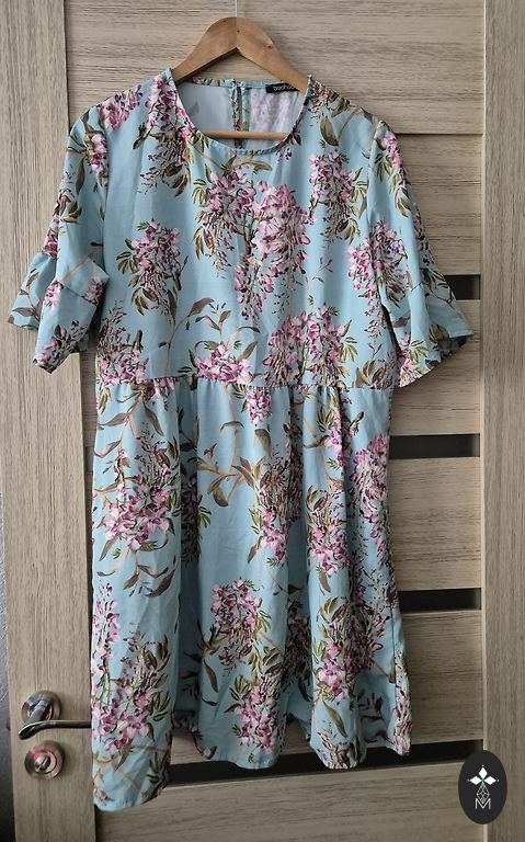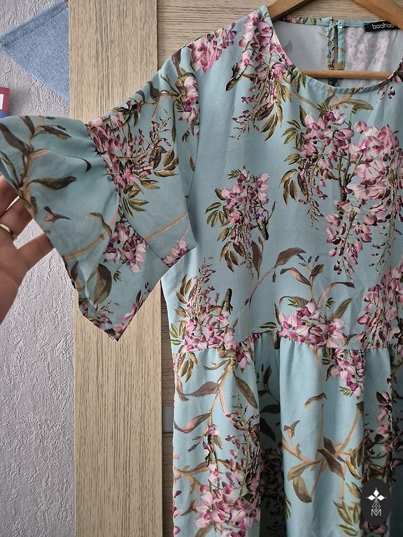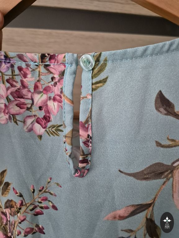 Bust up to 114cm, length approximately 93cm, long sleeves, 92% polyester, 8% elastane. Very comfortable, small buttons in the front, flounce-like hem at the bottom.