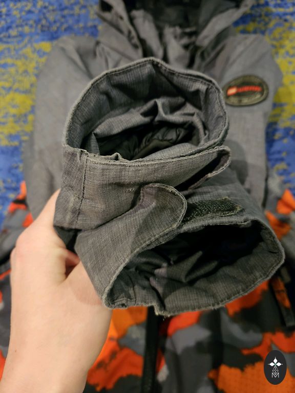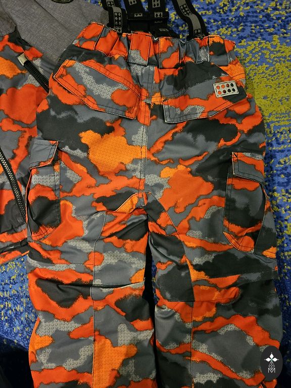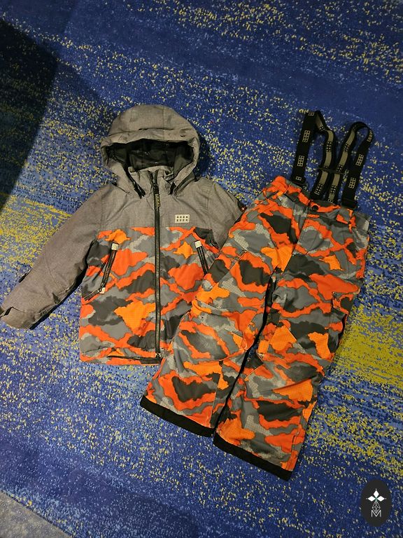 104 suurus. Väga soe, pikkus 92 cm, varruka pikkus 37 cm, sääre pikkus 38 cm. Tõmblukk ja takjakinnitused töötavad suurepäraselt. Kapuuts on eemaldatav. Põlved ja tagumik on pleekinud. Pükste otsad on kulunud, seal on üks väike auk.