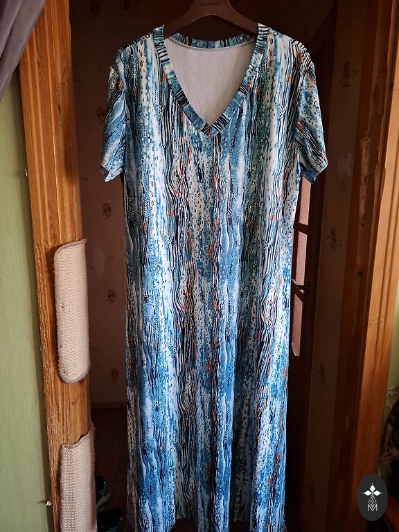 Nesigra, patogi suknelė, 16 dydis. Juosmens dalyje įsiūta 6 cm guma, kuri gerai pabrėžia juosmens liniją. Krūtinės dalis yra 56 cm pločio. Suknelės ilgis yra 114 cm, sijono dalies ilgis yra 72 cm. Rankovių galuose įsiūta guma, todėl rankovių ilgį lengva reguliuoti. Aukštas užsegimas kaklo zonoje su smulkiu mygtuku gale. Graži žalia fono spalva su leopardo raštu.