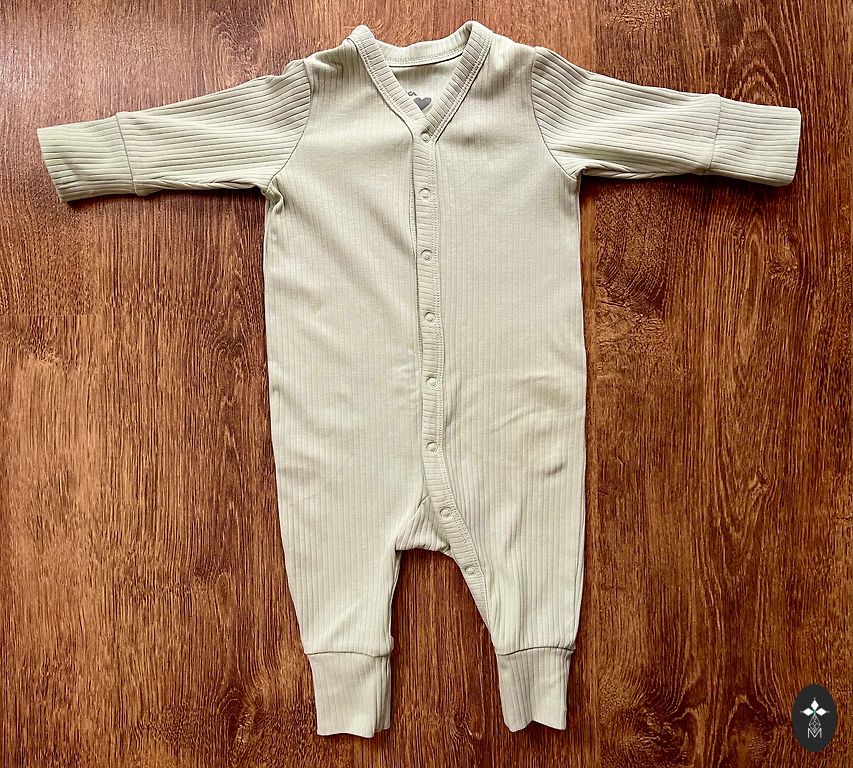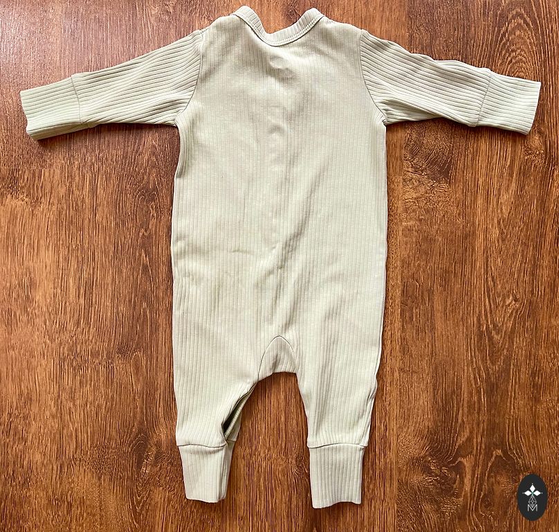 Komplektā rāpulītis ar slēgtām pēdiņām un wrap jeb kimono tipa bodijs (nevelkams pāri galvai, bet pogājams). 62 cm.
