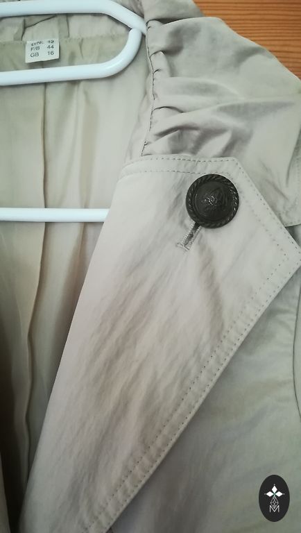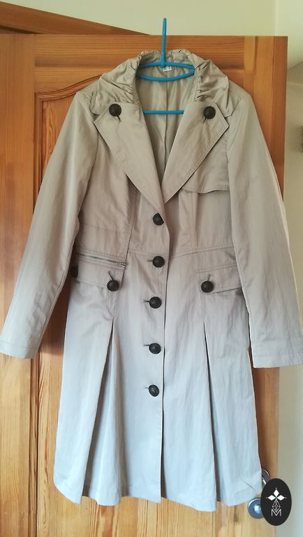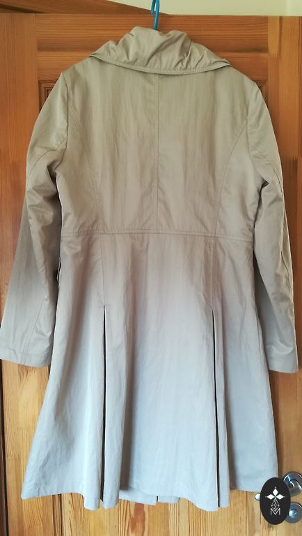 Gaiši bēša toņa.lietus -vēja materiāls.garums 115.zem padusēm 53.gurnos 58.piedurknes 64cm.oderēts.kabatas.