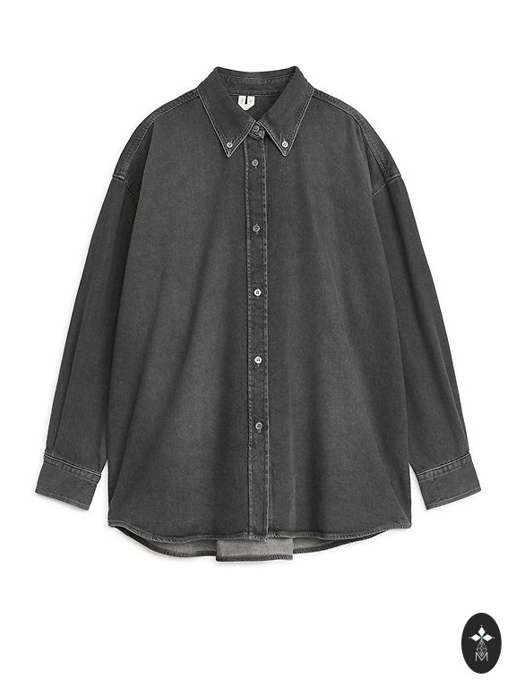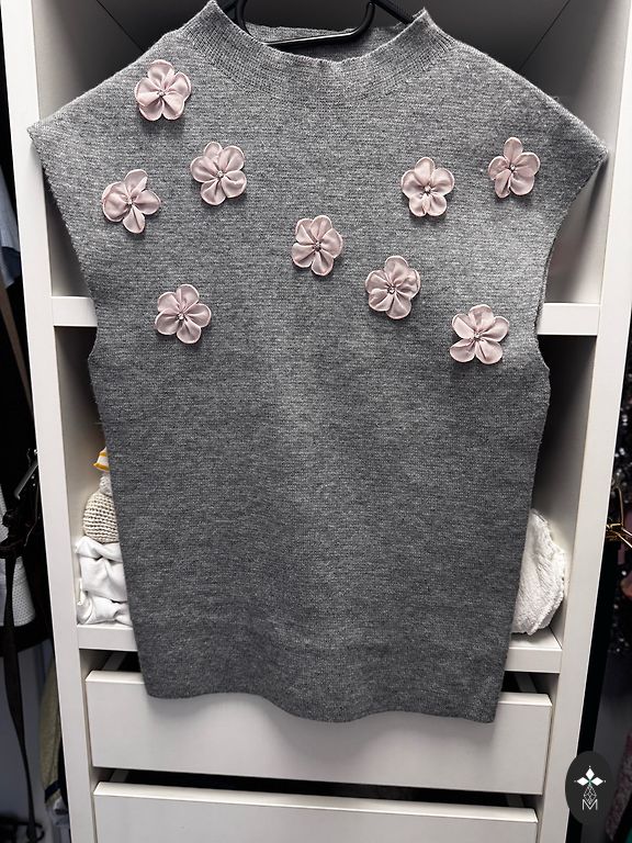 Белая блузка и серые кожаные леггинсы.