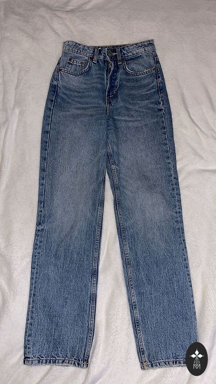 Patogios džinsinės kelnės su tiesiais (regular) kelnių galais, kišenėmis.