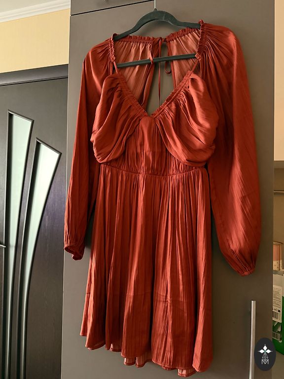 Suknelė žemiau kelių, dėvėta vieną kartą. Laisvo kirpimo, juosmenį reguliuoja gražus, platus diržas, kuris yra komplekte. Į audinį įaustos blizgios gijos (lureksas), švelnus švytėjimas!✨
